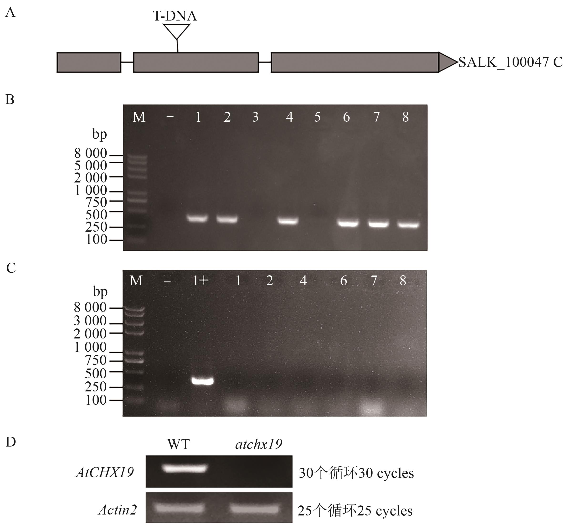 Fig. 8 Identification of T-DNA insertion mutants of AtCHX19 transgenic Arabidopsis thalianaA: T-DNA was inserted into the mutant SALK_100047C; B: PCR identification of AtCHX19 siliencing insertion; C: PCR identification of AtCHX19 siliencing homozygous; D: Identification of atchx19 mutants by RT-PCR. M—Trans2K Plus Ⅱ DNA Marker; - —Negative control; + —Positive control; 1~8—Arabidopsis mutants