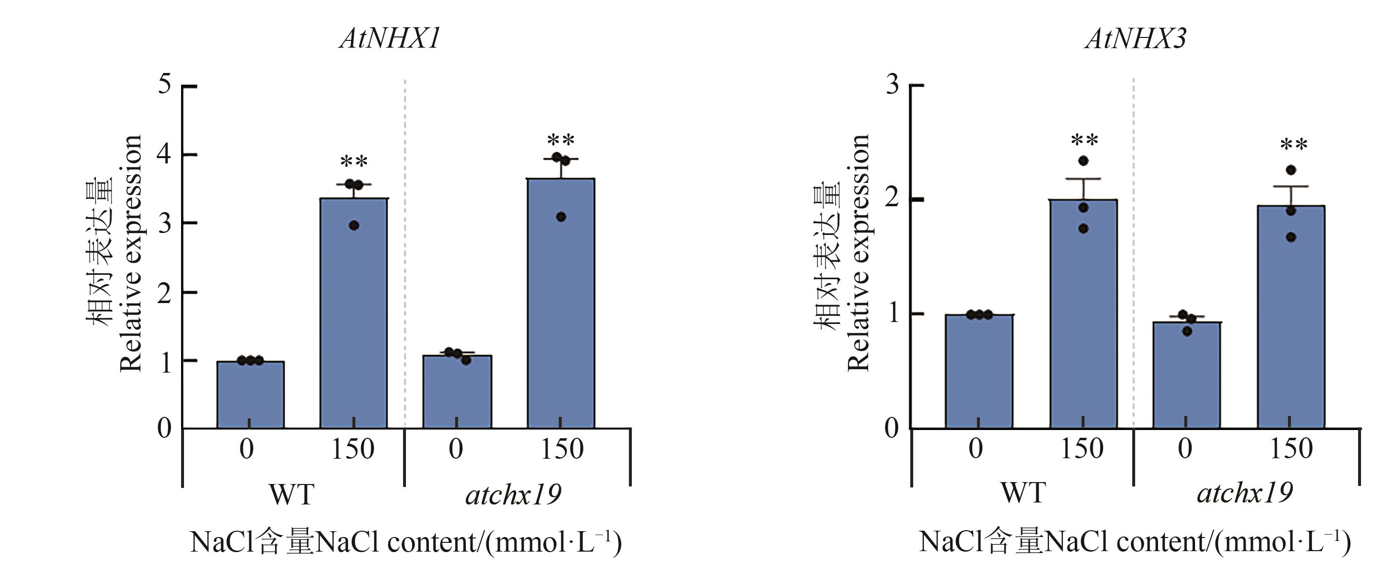 图9 150 mmol·L-1 NaCl处理下AtNHX1和AtNHX3基因的表达注:**表示与0 mmol·L-1 NaCl处理在P<0.01水平差异显著。
