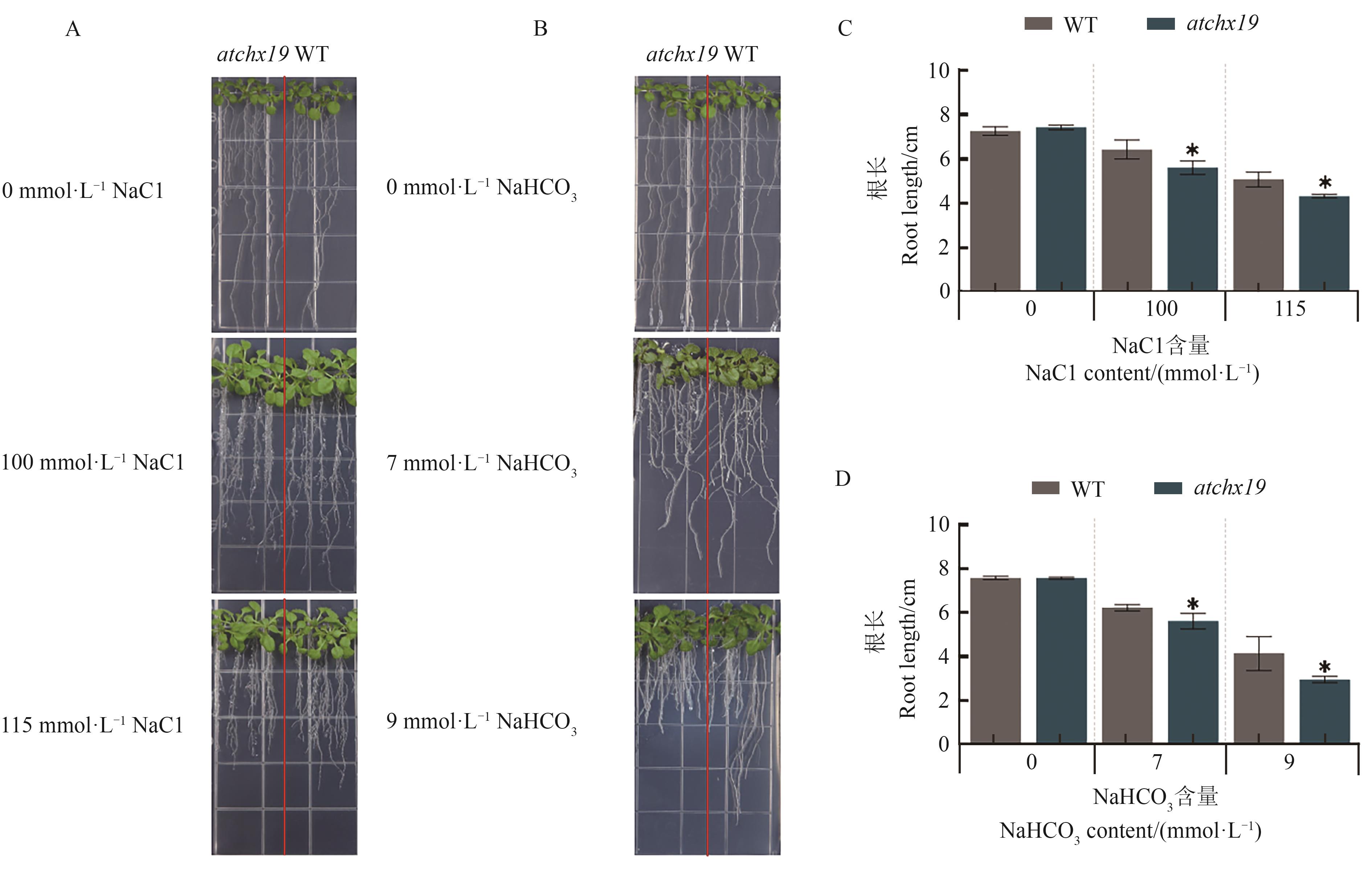 Fig. 10 Phenotypy of WT and mutant atchx19 atyoung seedlings stage under saline-alkali stressA: Phenotype of seedling under NaCl treatment; B: Phenotype of seedling under NaHCO3 treatment; C: Root length of seedling under NaCl treatment; D: Root length of seedling under NaHCO3 treatment. * indicates significant difference compared with WT at P<0.05 level