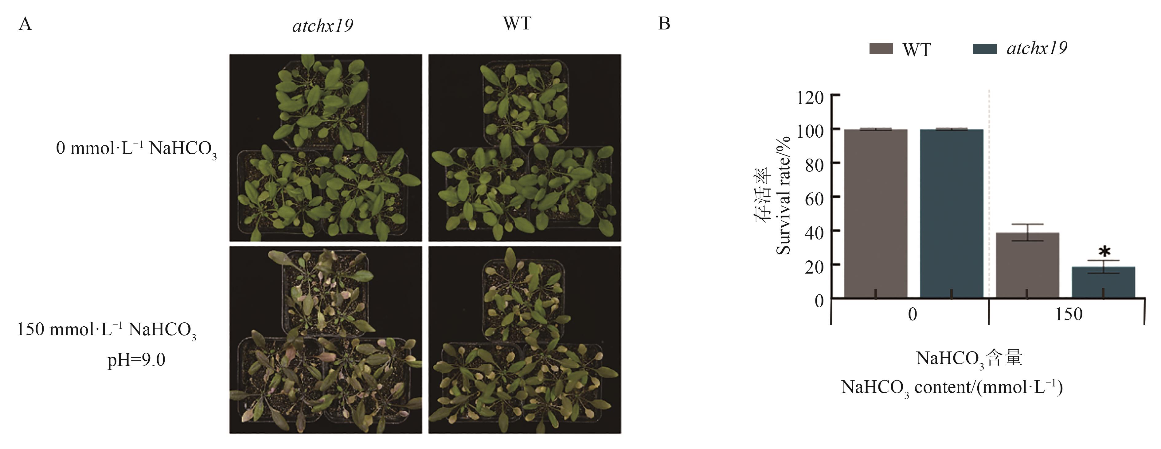 图11 不同盐碱胁迫下野生型和突变体atchx19在成苗期的表型A:表型;B:存活率;*表示突变体与野生型间在P<0.05水平差异显著。