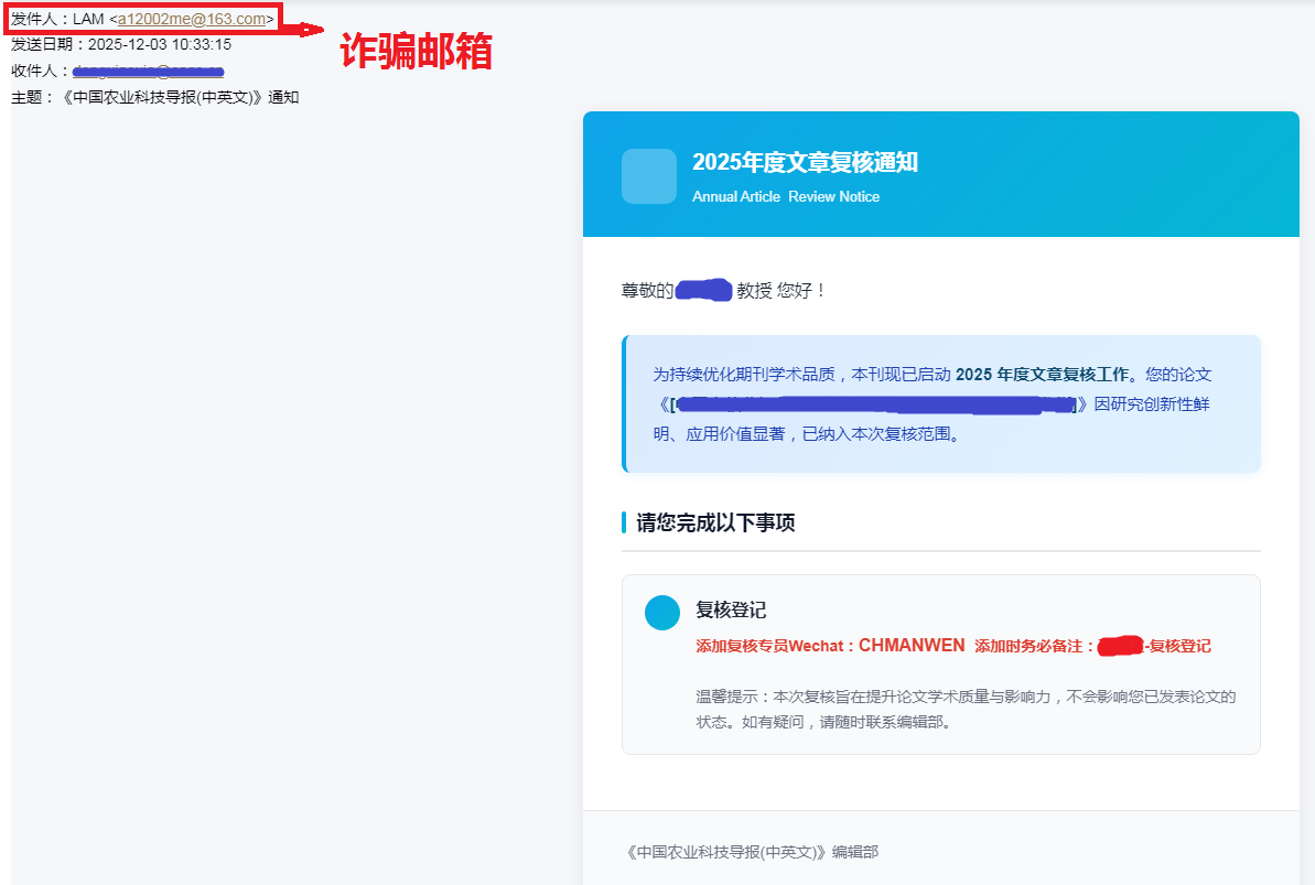 近期有部分作者收到“关于《中国农业科技导报(中英文)》文章抽查复核工作通知”的邮件(见附图案例),其发布虚假信息:为持续优化期刊学术品质,本刊现已启动2025年度文章复核工作。您的论文《*********》因研究创新性鲜明、应用价值显著,已纳入本次复核范围。并要求完成以下事项:添加复核专员微信,添加时务必备注‘作者姓名-复核登记’,并声称“本次复核旨在提升论文质量与影响力,不会影响您已发表的论文状态等。