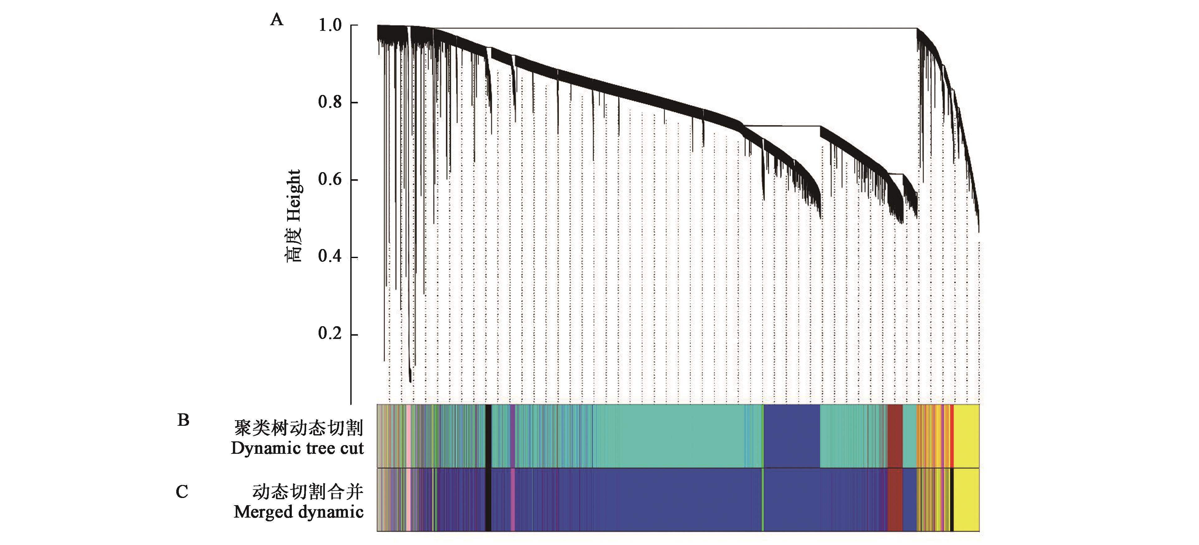 Fig.2 Gene cluster dendrograms and module divisionA: Clustering of genes based on the topological overlap; B: Gene modules obtained from the dynamic tree cut, and different colors represent different modules; C: Merged co-expression modules with similar expression pattern