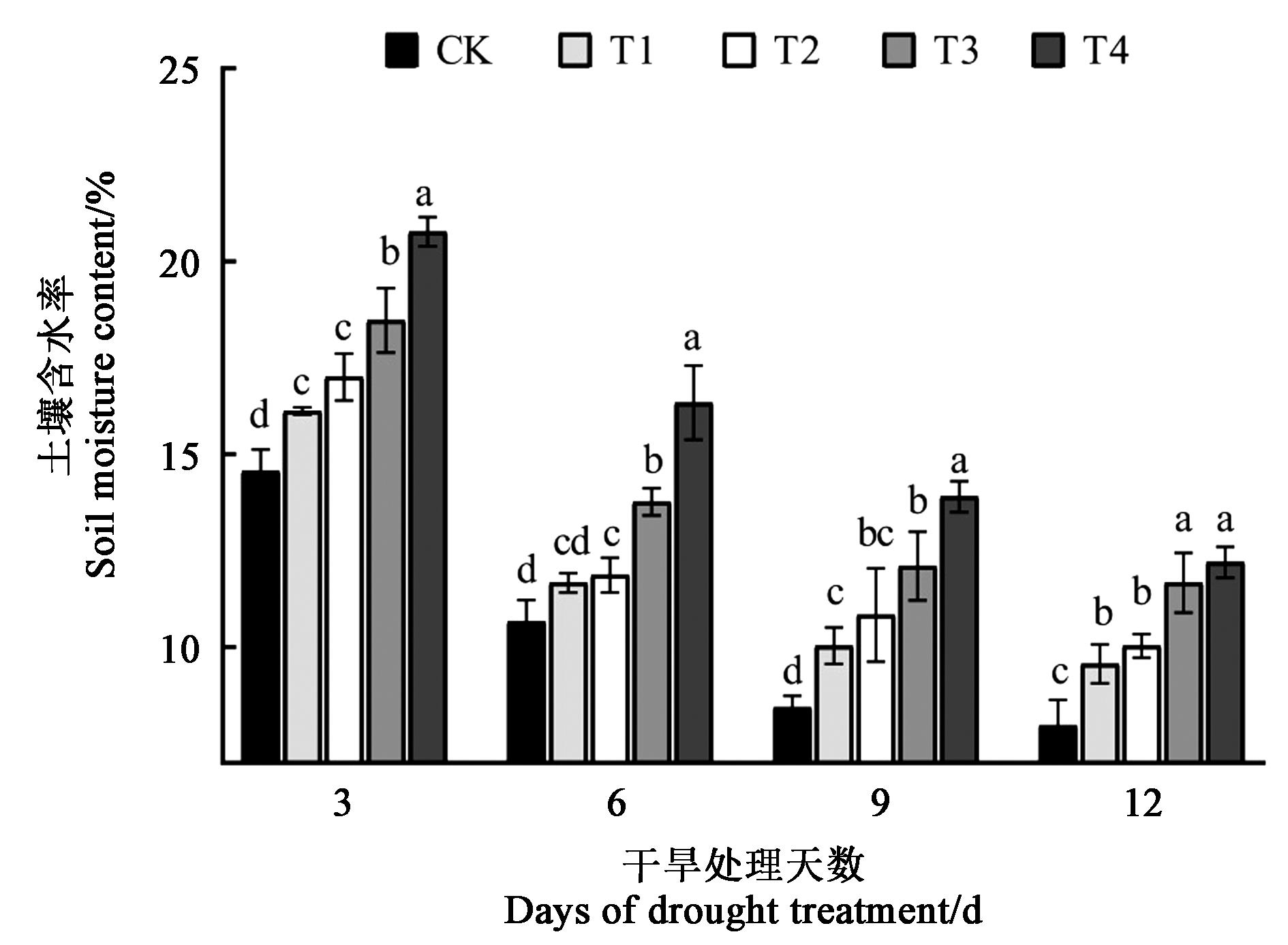 Fig.1 Effect of different dosages of water-retaining agent on soil moisture content under drought stressNote: Different small letters at the same treatment time indicate significant difference at P<0.05 level.
