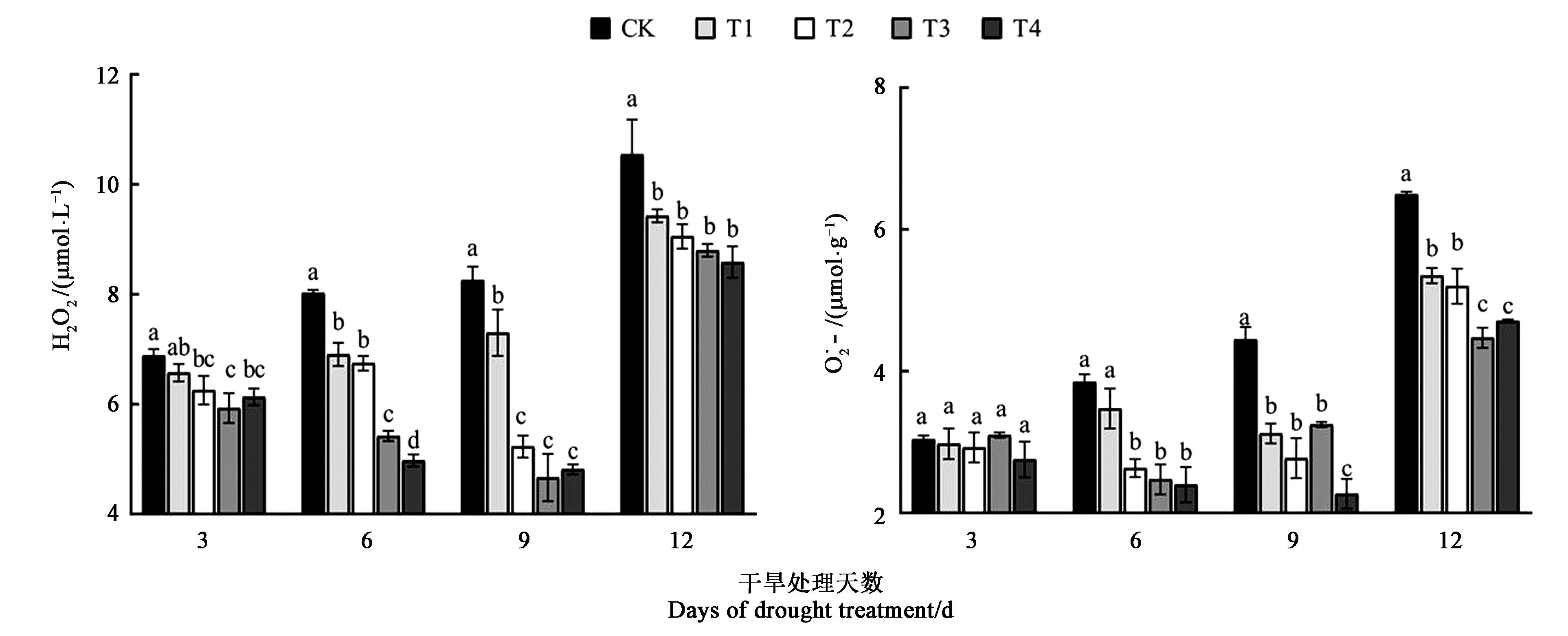 Fig.4 Effect of different dosages of water-retaining agent on active oxygen content of cigar tobacco leaves under drought stressNote: Different small letters at the same treatment time indicate significant difference at P<0.05 level.