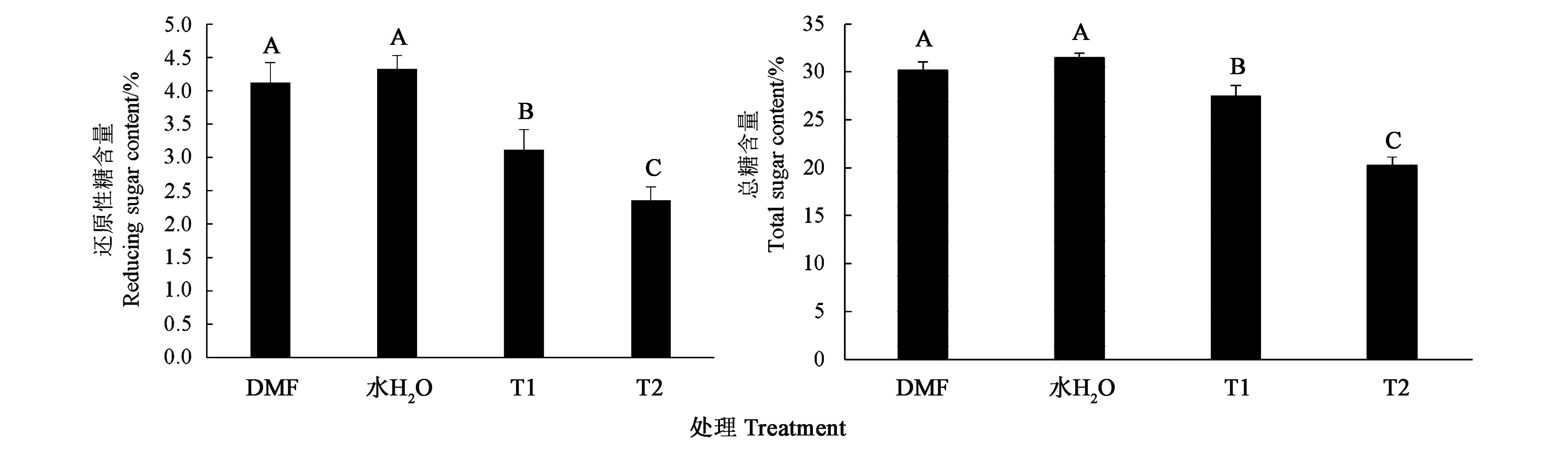 Fig.2 Sugar content of G. pseudoferreum after treated with volatilized active componentsNote: Different letters in the figure indicate significant differences between different treatments at P <0.01 level.