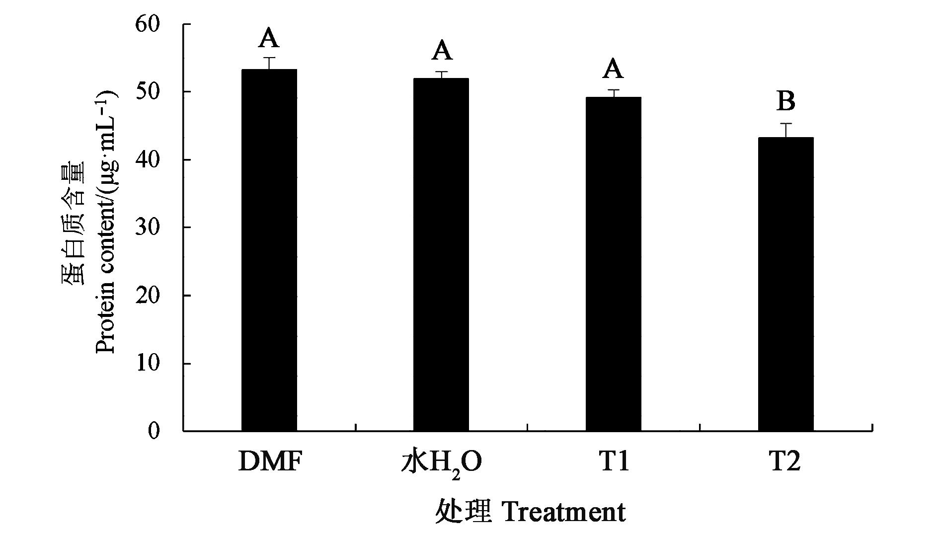 Fig.3 Protein content of G.pseudoferreum after treated with volatilized active componentsNote: Different letters in the figure indicate significant differences different treatments at P <0.01 level.