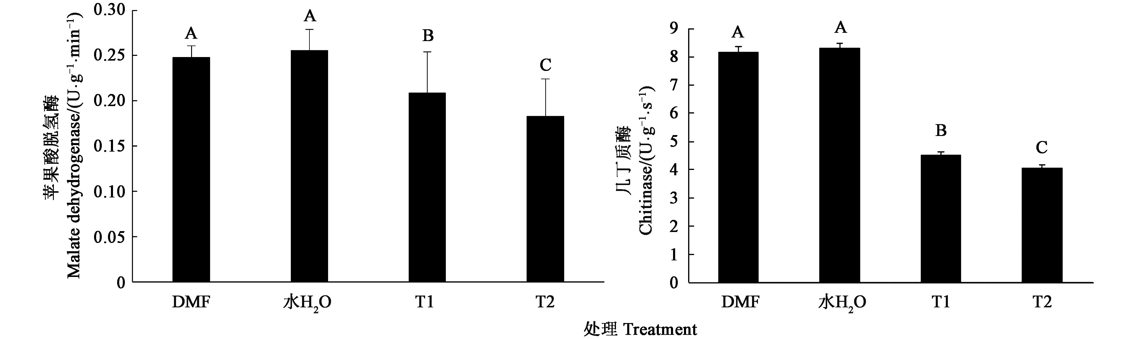 Fig.4 Activity of malate dehydrogenase and chitinase of G. pseudoferreum after treated with volatilized active componentsNote: Different letters in the figure indicate significant differences different treatments at P <0.01 level.
