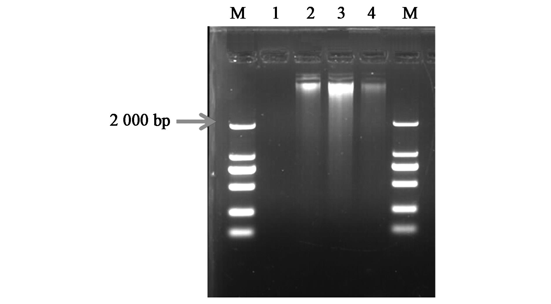 Fig.6 DNA of G. pseudoferreum after treated with volatilized active componentsNote: M—DNA Marker 2000; 1—Control; 2—Not treated by volatilized active components; 3—T1 treatment; 4—T2 treatment.