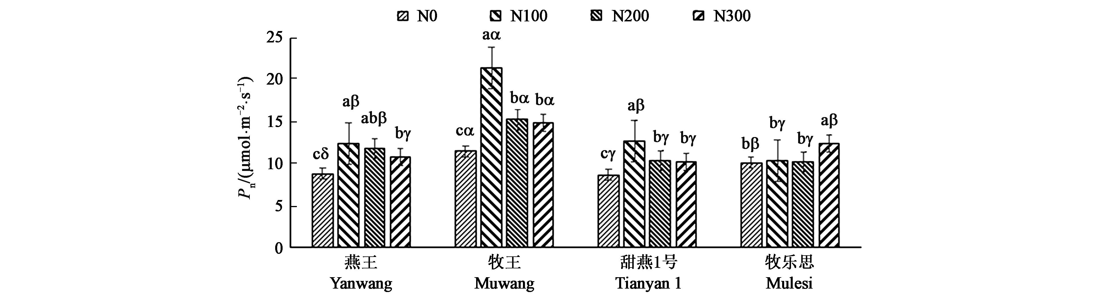 Fig.1 Pn of different forage oat varieties under different nitrogen treatmentNote: Different English letters indicate significant difference among different treatments of the same variety (P<0.05); different Greek letters indicate significant difference among different varieties of the same treatment (P<0.05).
