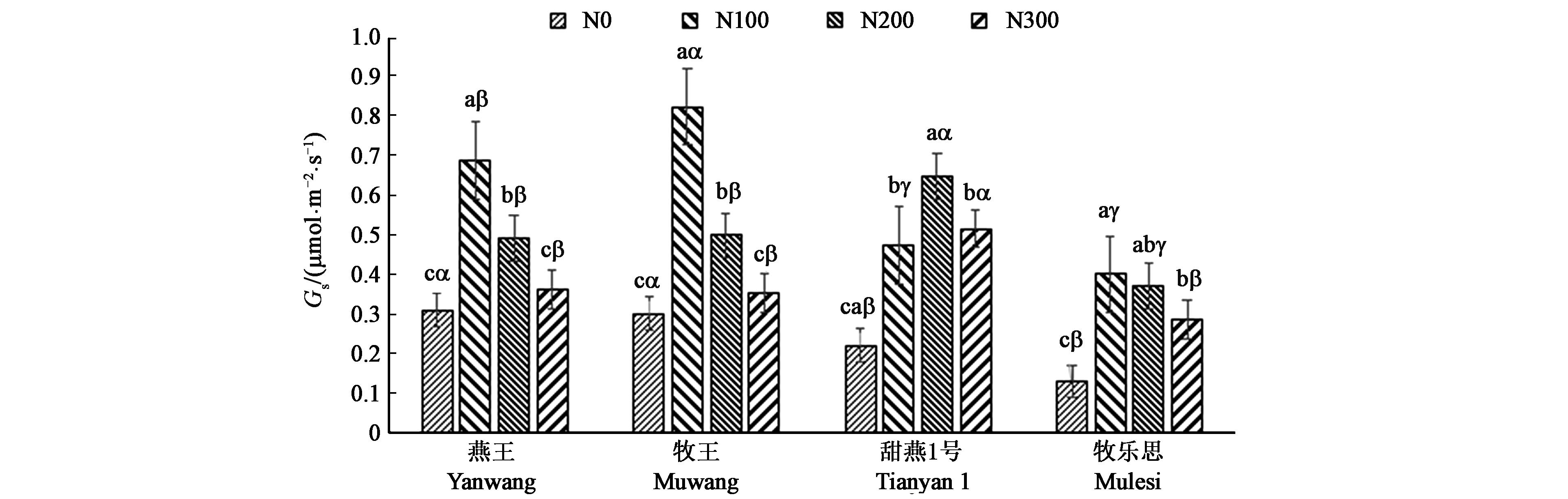 Fig.2 Gs of different forage oat varieties under different nitrogen application levelsNote: Different English letters indicate significant difference among different treatments of the same variety (P<0.05); different Greek letters indicate significant difference among different varieties of the same treatment (P<0.05).