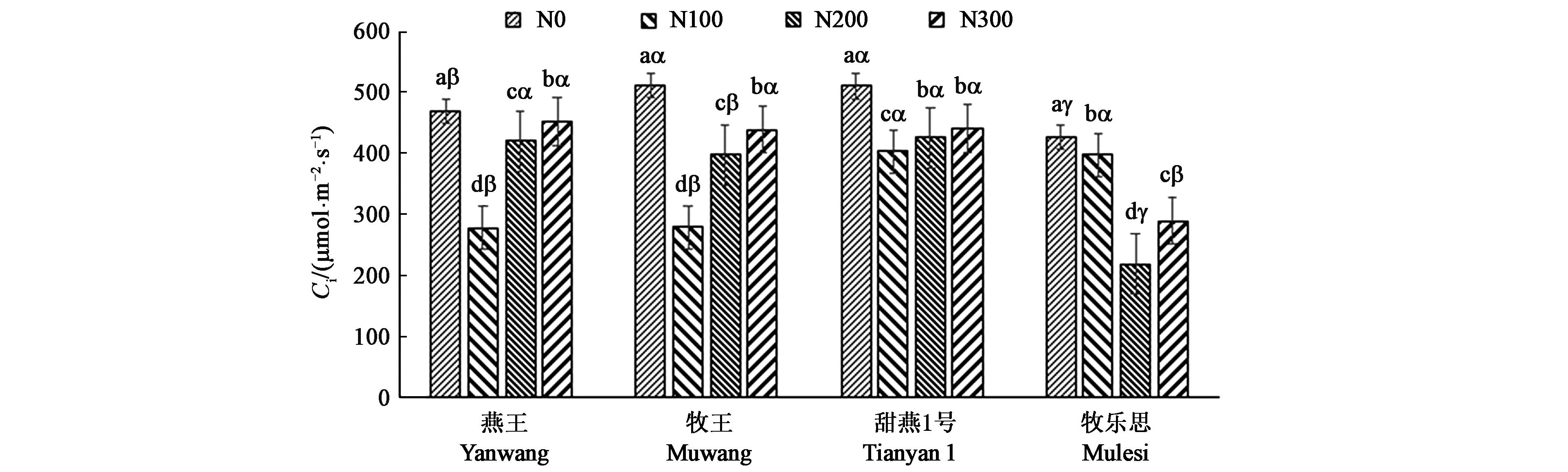 Fig. 3 Ci of different oat varieties under different nitrogen treatmentNote: Different English letters indicate significant difference among different treatments of the same variety (P<0.05); different Greek letters indicate significant difference among different varieties of the same treatment (P<0.05).