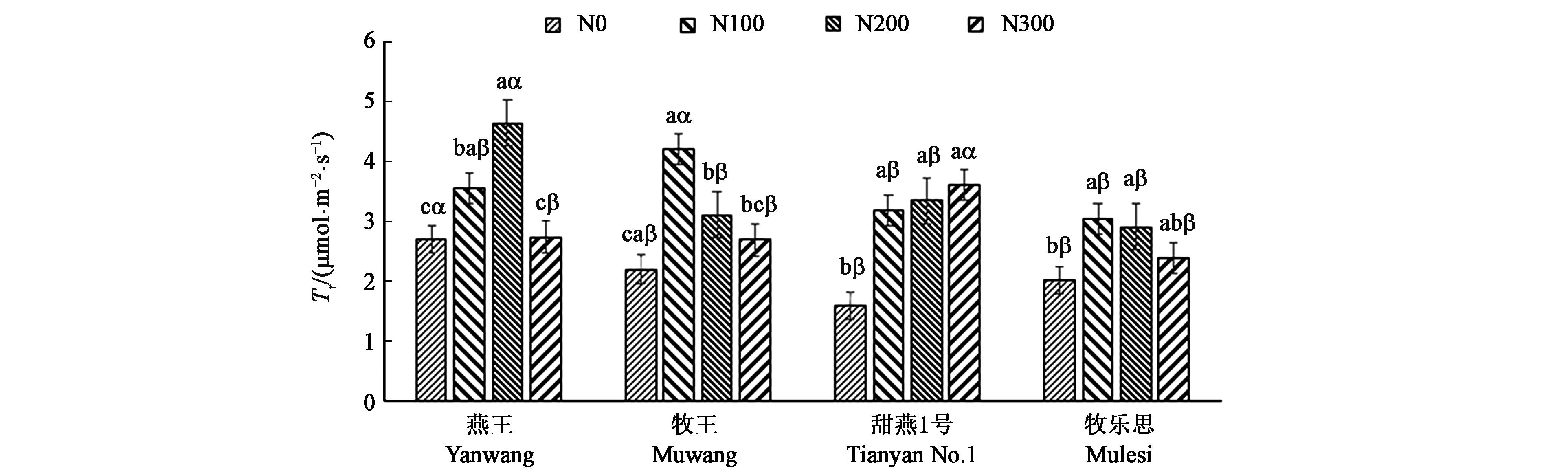 Fig.4 Tr of different forage oat varieties under different nitrogen treatmentNote: Different English letters indicate significant difference among different treatments of the same variety (P<0.05); different Greek letters indicate significant difference among different varieties of the same treatment (P<0.05).