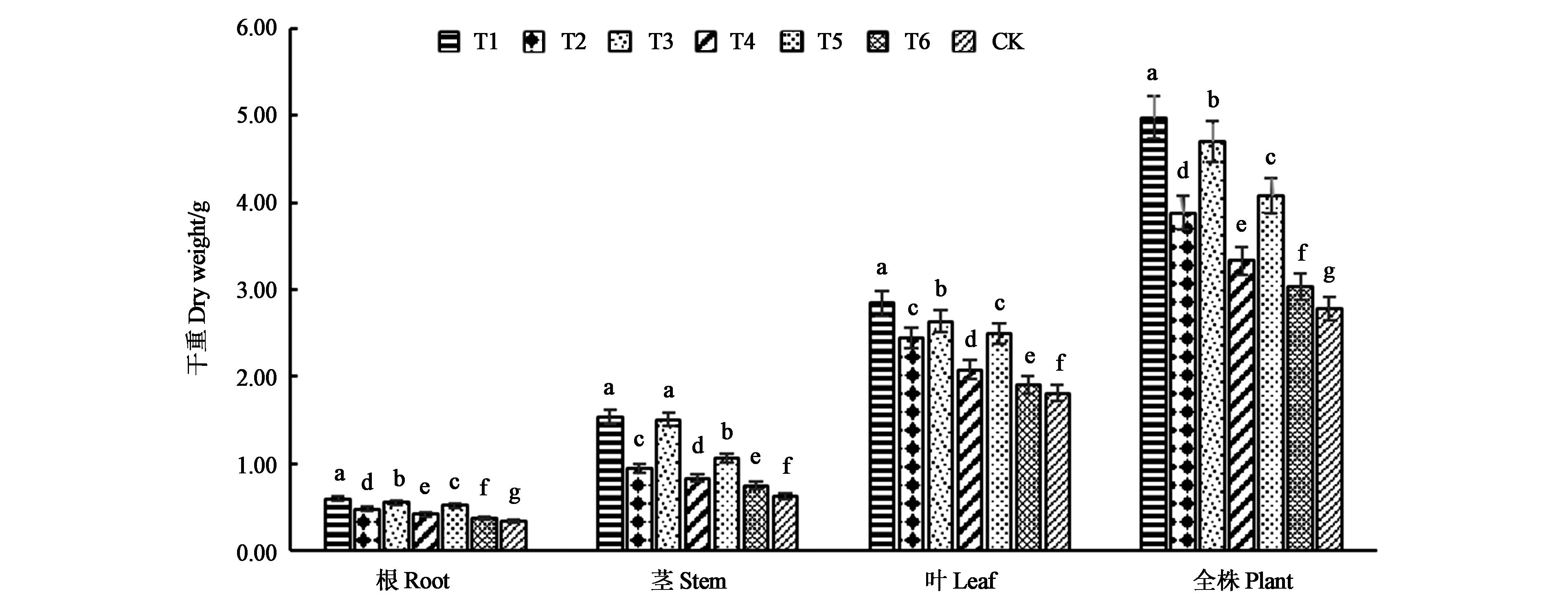 Fig.2 Dry weight of tobacco seedings under different treatmentsNote: Different small letters at the same part indicate significant difference(P<0.05).