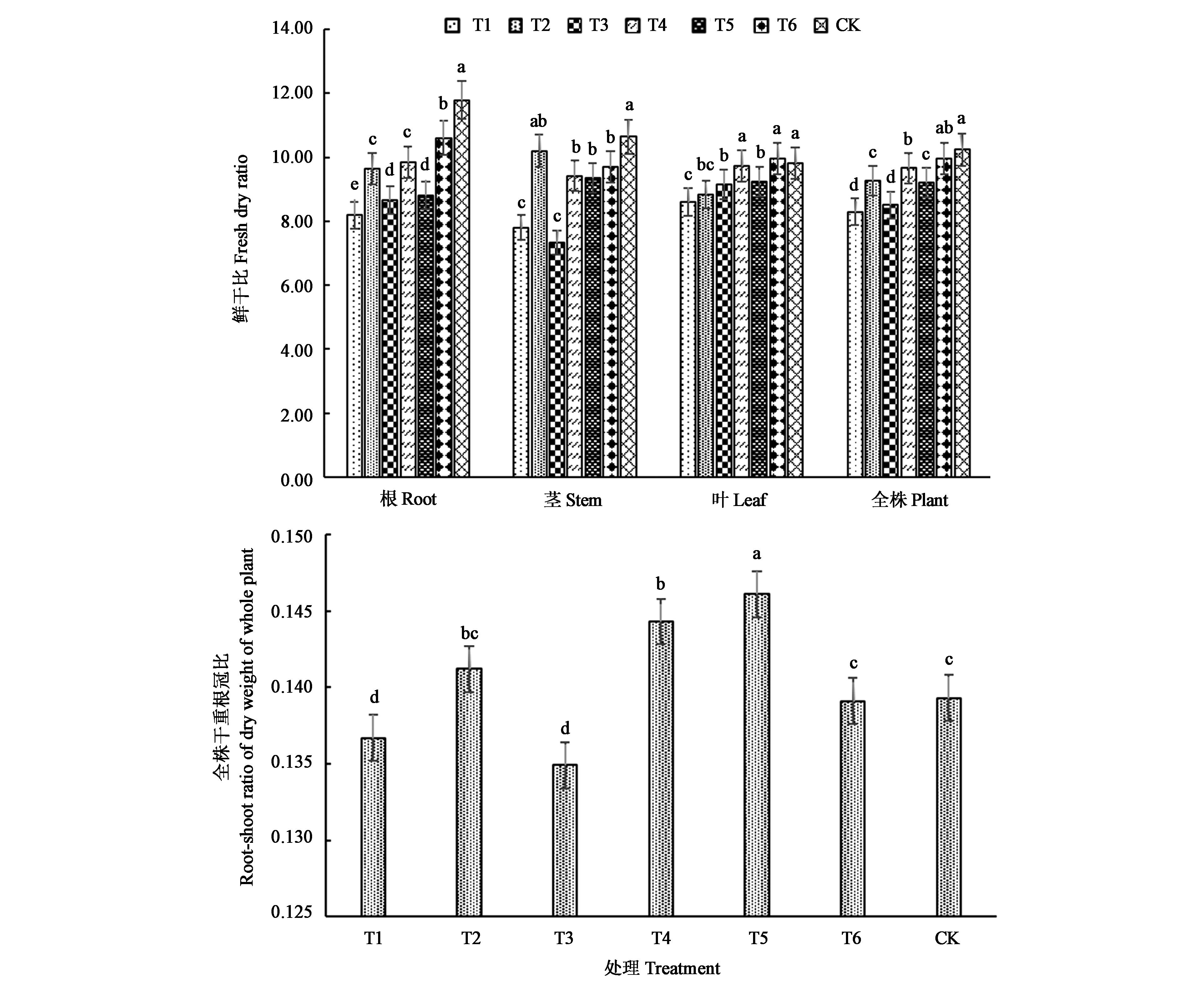 Fig.3 Radio of tobacco seedings fresh and dry,root?shoot ratio of dry weight of whole plant with different treatmentsNote: Different small letters at the same part indicate significant difference(P<0.05).