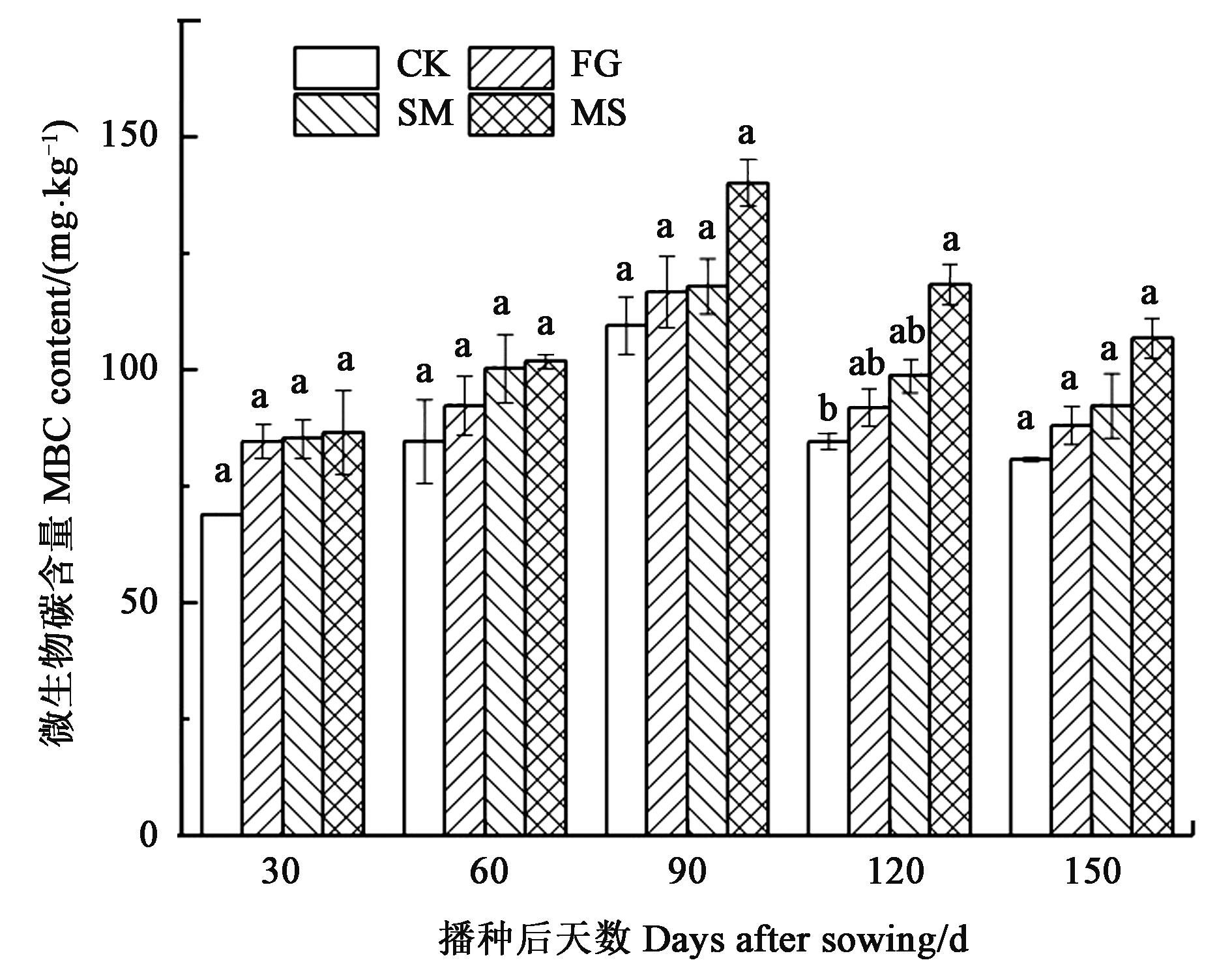 Fig. 3 MBC contents of different treatmentsNote:Different lowercase letters indicate significant differences between different treatments of same stage at P<0.05 level.