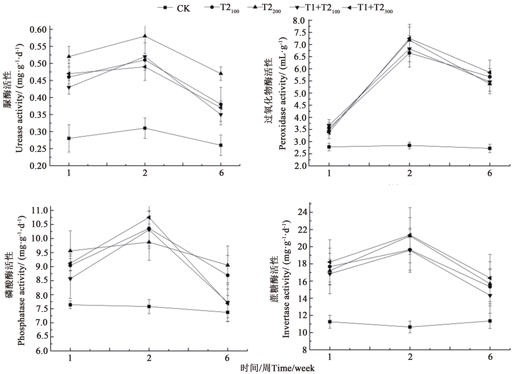 T1+T2100 | 2.10±0.12 bc | 11.11 | 12.54±0.81 ab | 44.97 | 14.64±0.93 ab | 38.90 | 377.36±7.35 a | 35.51 |
