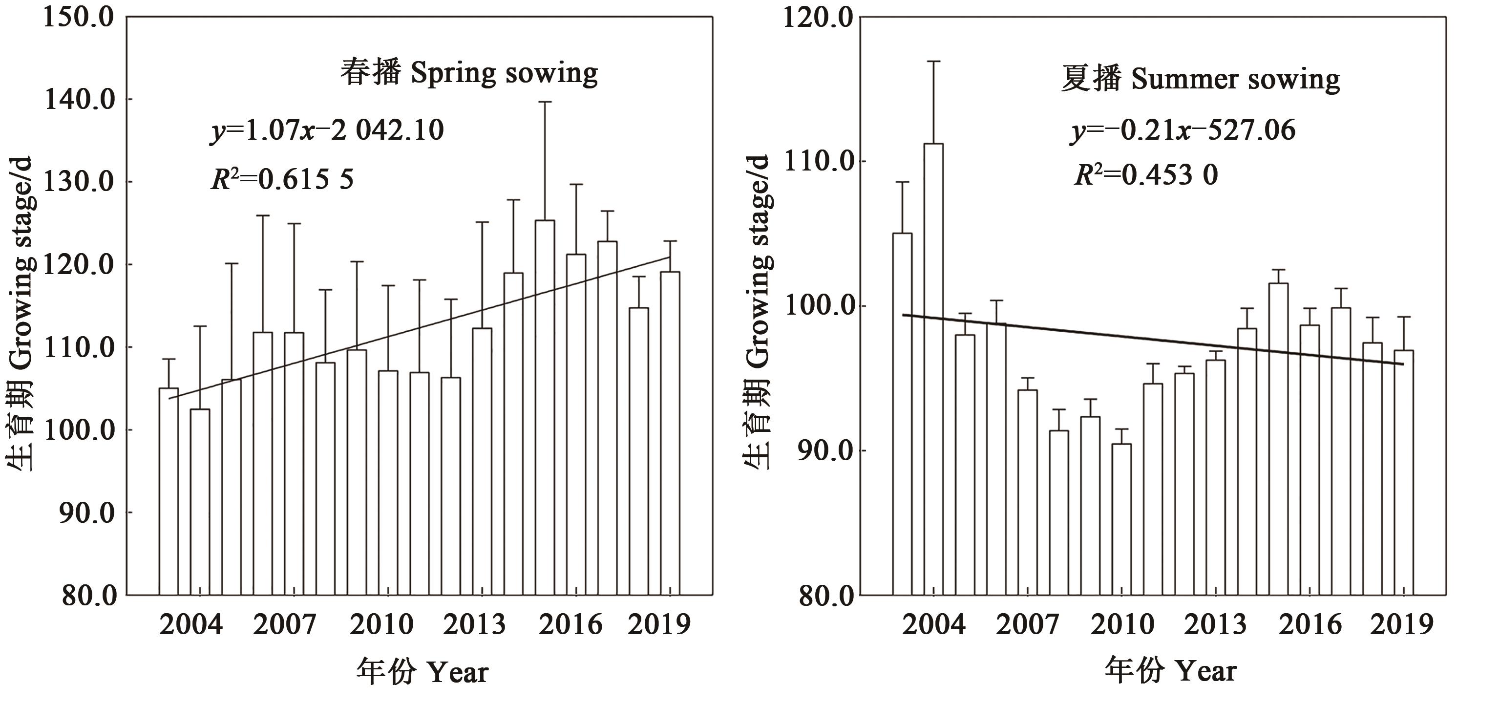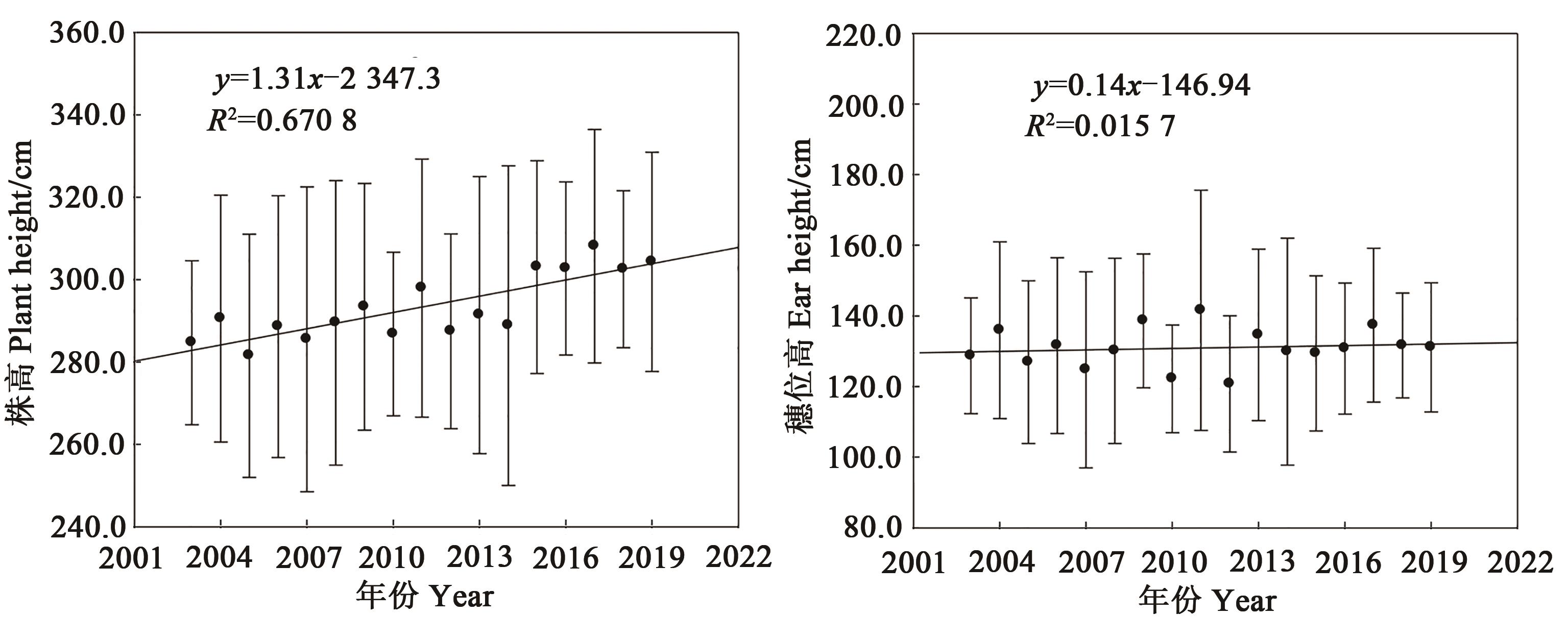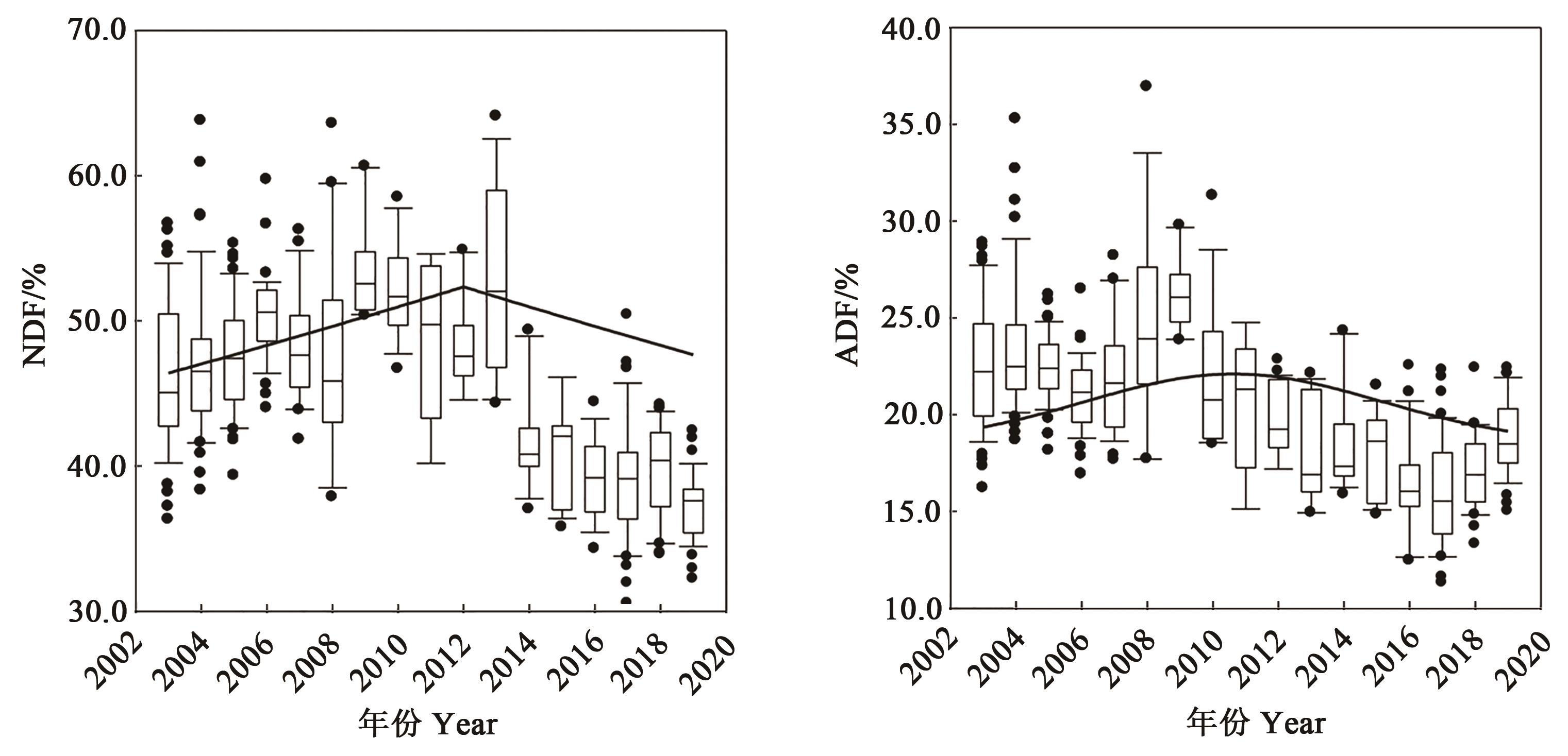 青贮玉米以其特有的优势居于现代农业的重要位置。系统分析了2003—2019年累计394个参加国家玉米品种区域试验青贮玉米组合(品种)的农艺性状、生物产量和品质的变化,为未来中国青贮玉米产业发展和品种选育提供依据和参考。结果表明:①2003—2019年参试青贮玉米组合(品种)的生育期平均为111.8 d,春播组合(品种)平均为109.3 d,比夏播组合(品种)长9.7 d,春播组合(品种)生育期呈延长趋势,而夏播组合(品种)呈缩短趋势;②参试青贮玉米组合(品种)的平均株高和穗位高分别为300.5和132.3 cm,2003—2019年株高和穗位高呈升高趋势,近10年株高增加了12.5 cm,而穗位高仅增加了2.1 cm;③参试青贮玉米组合(品种)生物产量平均为19 477.5 kg DW·hm-2,2003—2019年呈先降低后升高趋势,2011—2019年较2003—2010年增加了721.8 kg·hm-2;④参试青贮玉米组合(品种)的平均中性洗涤纤维(NDF)和酸性洗涤纤维(ADF)含量分别为46.7%和21.5%,2003—2019年呈先升高后逐年降低趋势,2011—2019年NDF和ADF含量分别较2003—2010年降低了6.8和5.5个百分点;⑤参试青贮玉米组合(品种)的粗蛋白含量平均为8.7%,年际间变幅较小,全株淀粉含量平均为31.0%(2014—2019年),呈逐年升高和集中趋势。连续17年国家青贮玉米品种区域试验分析结果表明,青贮玉米组合(品种)春播生育期呈延长趋势、夏播则逐步缩短;株高增加,但穗位高变化不大;品质改良取得显著成效,NDF和ADF含量显著降低,淀粉含量明显提升,粗蛋白含量保持稳定;生物产量整体有所提升。