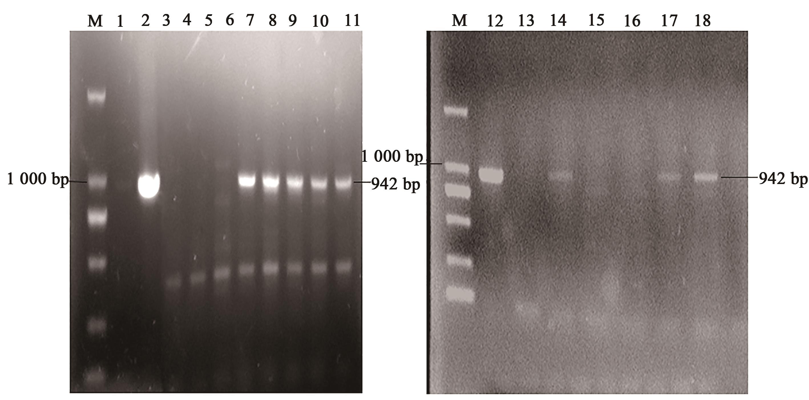 Fig.1 PCR identification of FAT-1 gene integration in F1 transgenic cattleNote:M—DL2 000 DNA marker; 1—Negative control(water); 2, 12—Positive control plasmid; 11—ZK002 positive control; 3~10, 13~18—Cattle to be tested.