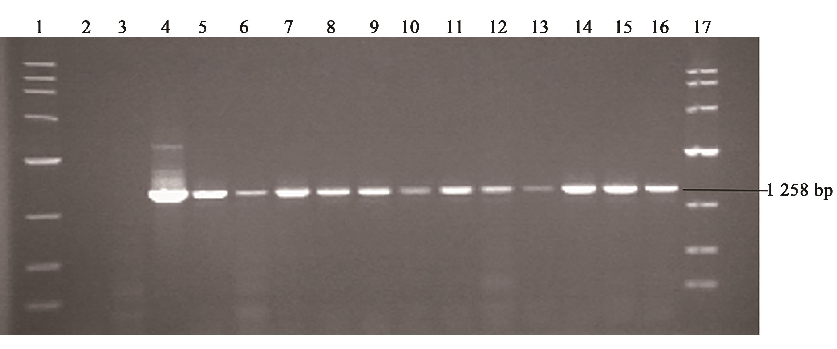 Fig.3 RT-PCR detection of the expression of FAT1 gene in transgenic F2 generation cattleNote:1—DL10000 marker;2—Negative control(water);3—Negative control(wild type cattle);4—pST200 plasmid positive control;5~16—Cattle to be tested;17—DL 10000 marker.