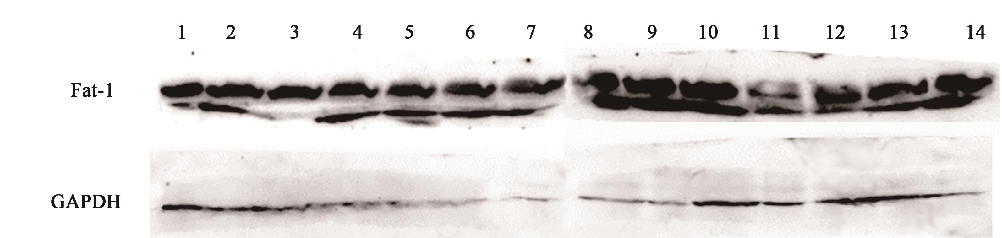 Fig.4 Western blotting detection of the FAT1 gene expressionNote:1~6, 8~13—190220、190221、1904051、1904052、190427、190429,190505、190506、190510、190623、190624、190630; 7,14—ZK005.