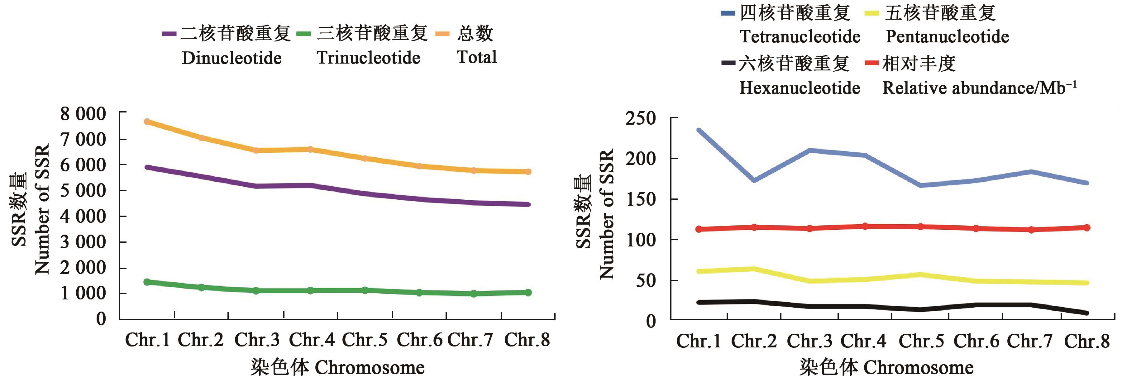 重复基元 Repeat motif | Chr.1 | Chr.2 | Chr.3 | Chr.4 | Chr.5 | Chr.6 | Chr.7 | Chr.8 | 总计 Total | 比例 Percentage/% |