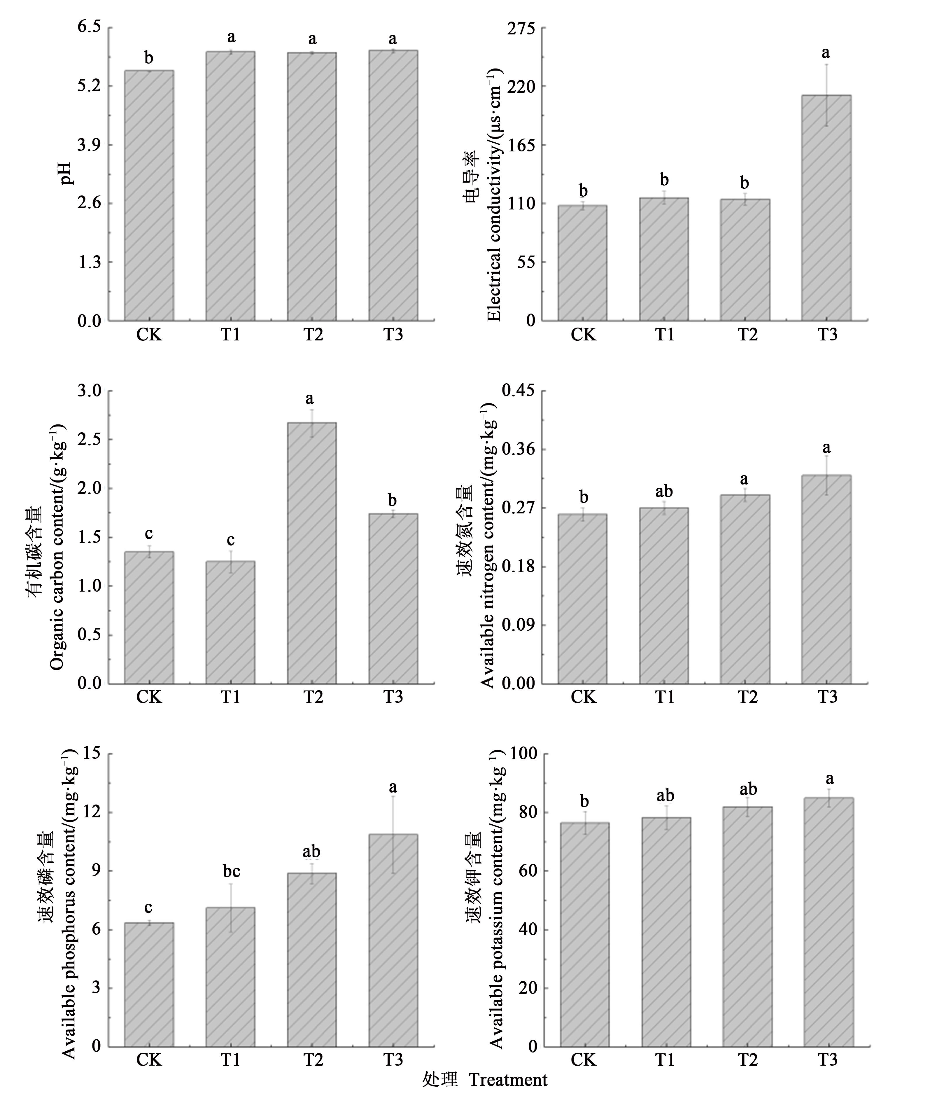 Fig. 1 Soil nutrients under different treatmentsNote:Different lowercase letters in figure indicate significant differences between different treatments at P<0.05 level.