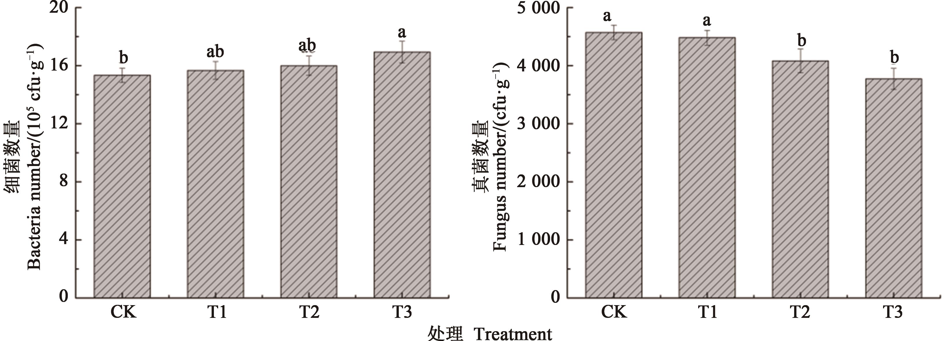 Fig. 2 Number of soil microorganisms under different treatmentsNote:Different lowercase letters in figure indicate significant differences between different treatments at P<0.05 level.