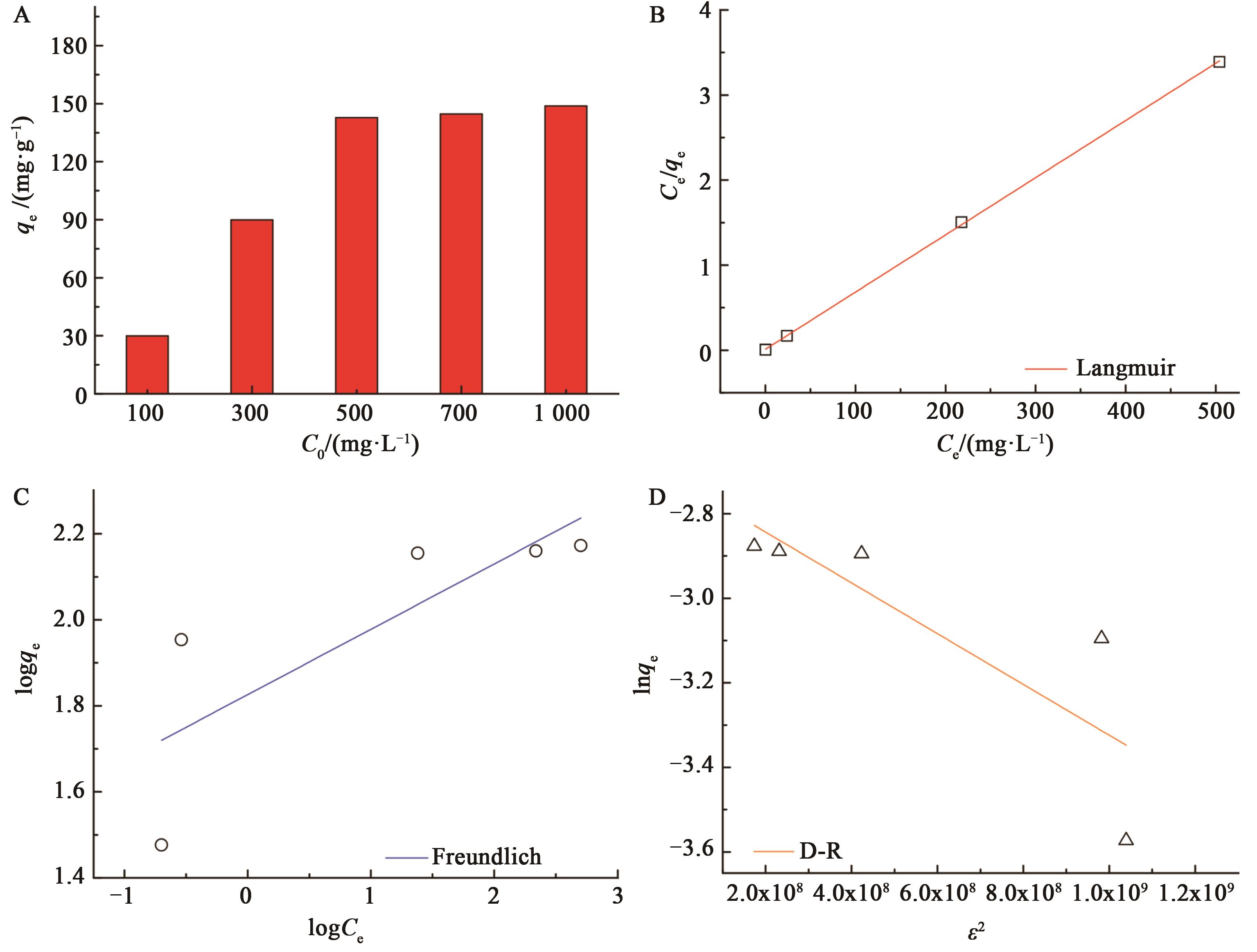 Fig. 2 Adsorption of CMBC-400 on different Pb2+ mass concentrations and linear fitting for adsorption kineticsA: Effect of initial concentration on Pb2+ adsorption; B: Langmuir fitting curves; C: Freundlich fitting curves; D: D-R fitting curves