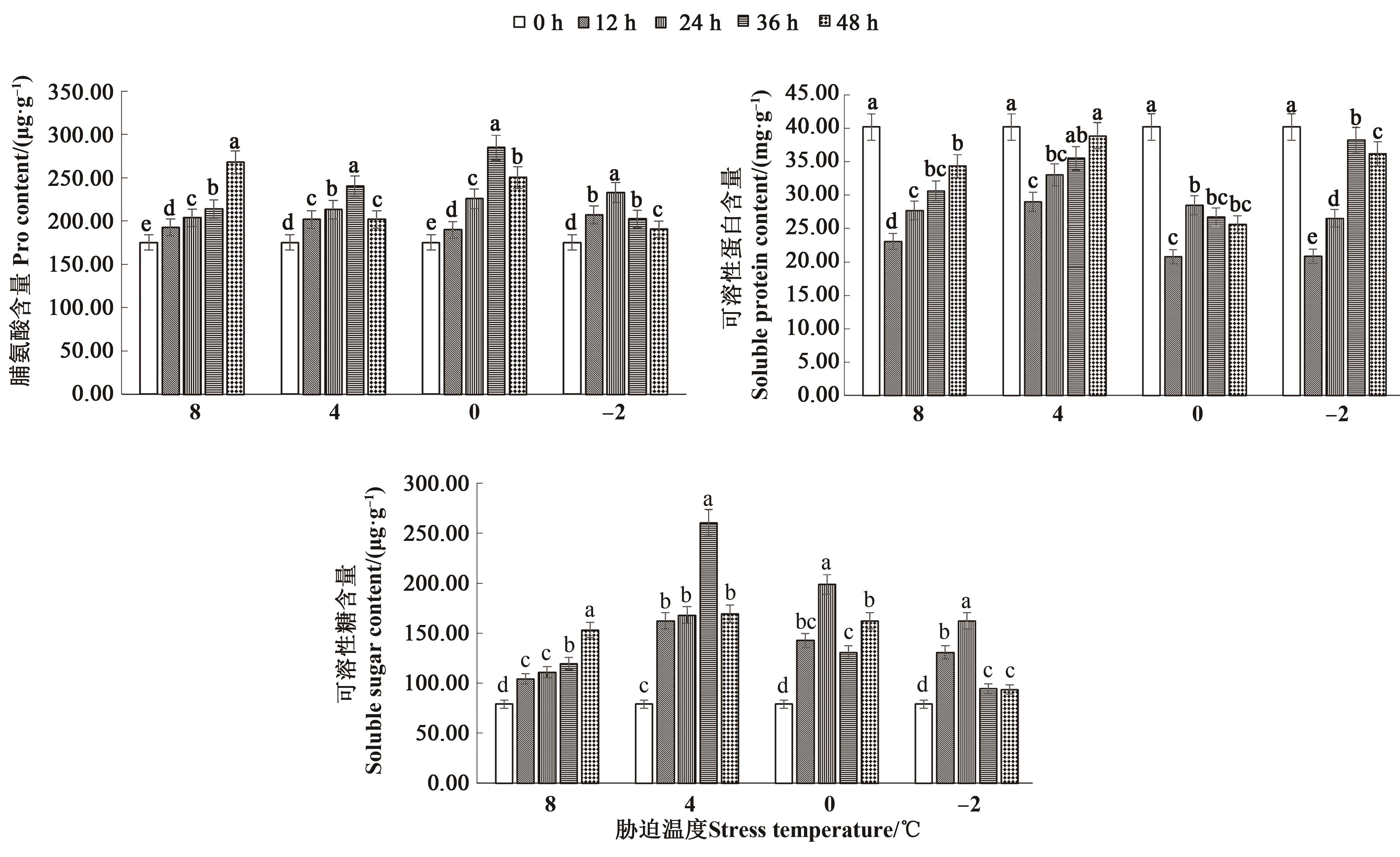 Fig. 1 Proline, soluble protein and soluble sugar contents in coffee leaves under different treatmentsNote: Different lowercase letters at the same temperature indicate significant differences at P<0.05 level.
