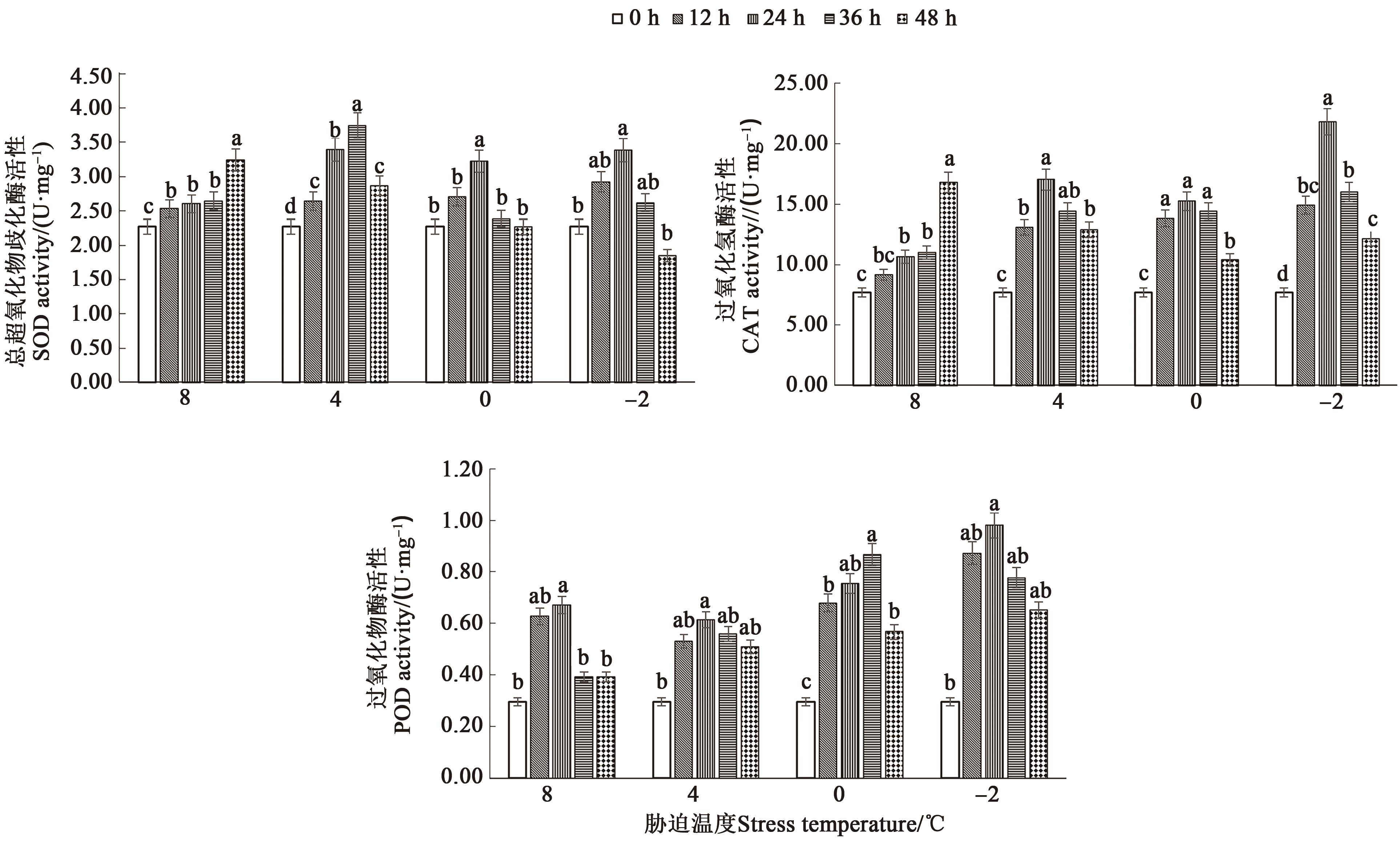 Fig. 2 SOD, CAT and POD activities in coffee leaves under different treatmentsNote: Different lowercase letters at the same temperature indicate significant differences at P<0.05 level.