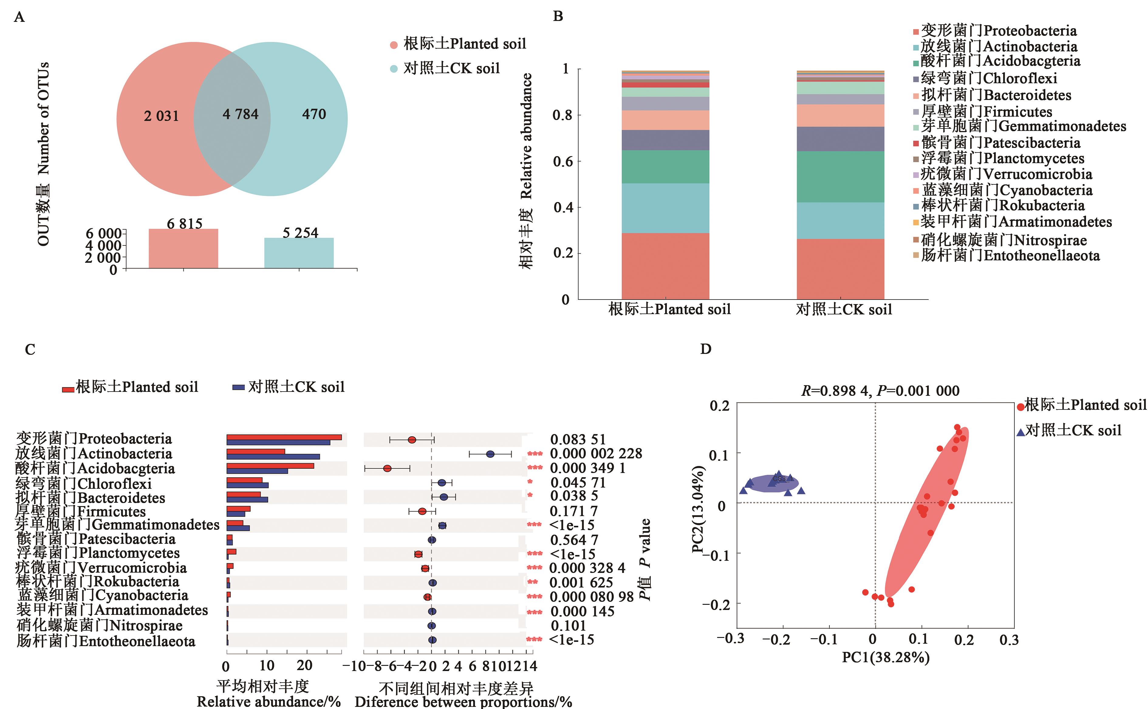 Fig. 2 Effects of planted potato on bacterial diversityA:OTUs analysis;B:Relative abundance of dominant bacteria at phylum level;C:Differences between CK and rhizosphere soils;D:PCoA analysis.*,** and *** indicate significant differences at P<0.05,P<0.01 and P<0.001 levels,respectively.