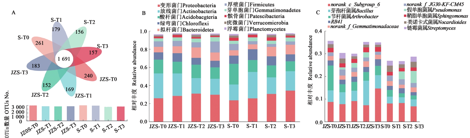 Fig. 3 Bacterial community abundance in potato rhizosphere under drought stressA: OTUs analysis; B: Phylum level; C: Genus level in potato rhizosphere