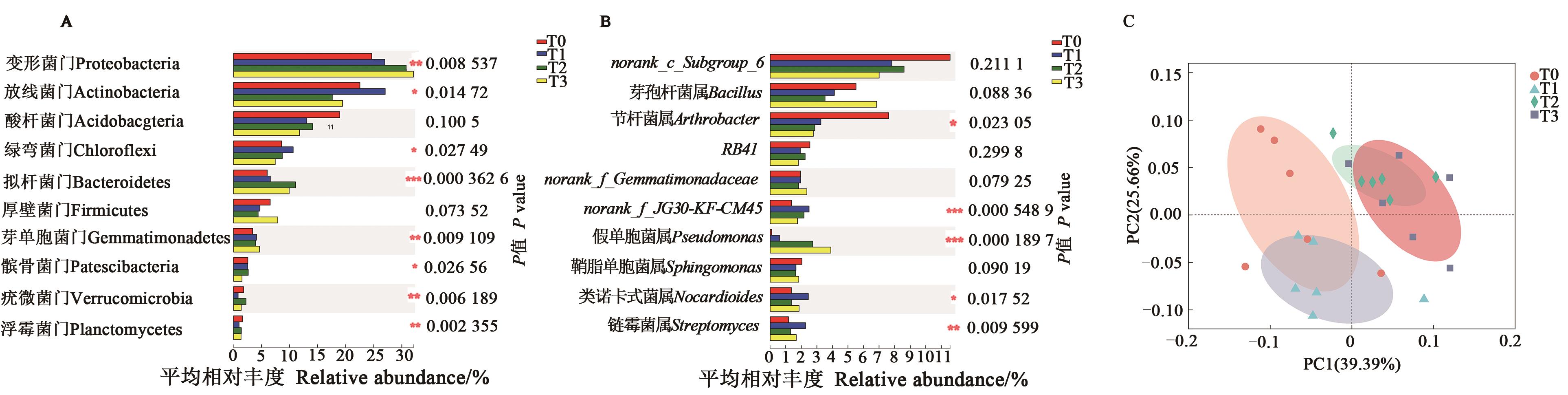 Fig. 4 Difference and distribution of rhizosphere soils under drought stressNote:A—Phylum level; B—Genus level; C—PCoA analysis on Phylum level. *, ** and *** indicate significant differences at P<0.05, P<0.01 and P<0.001 levels, respectively.