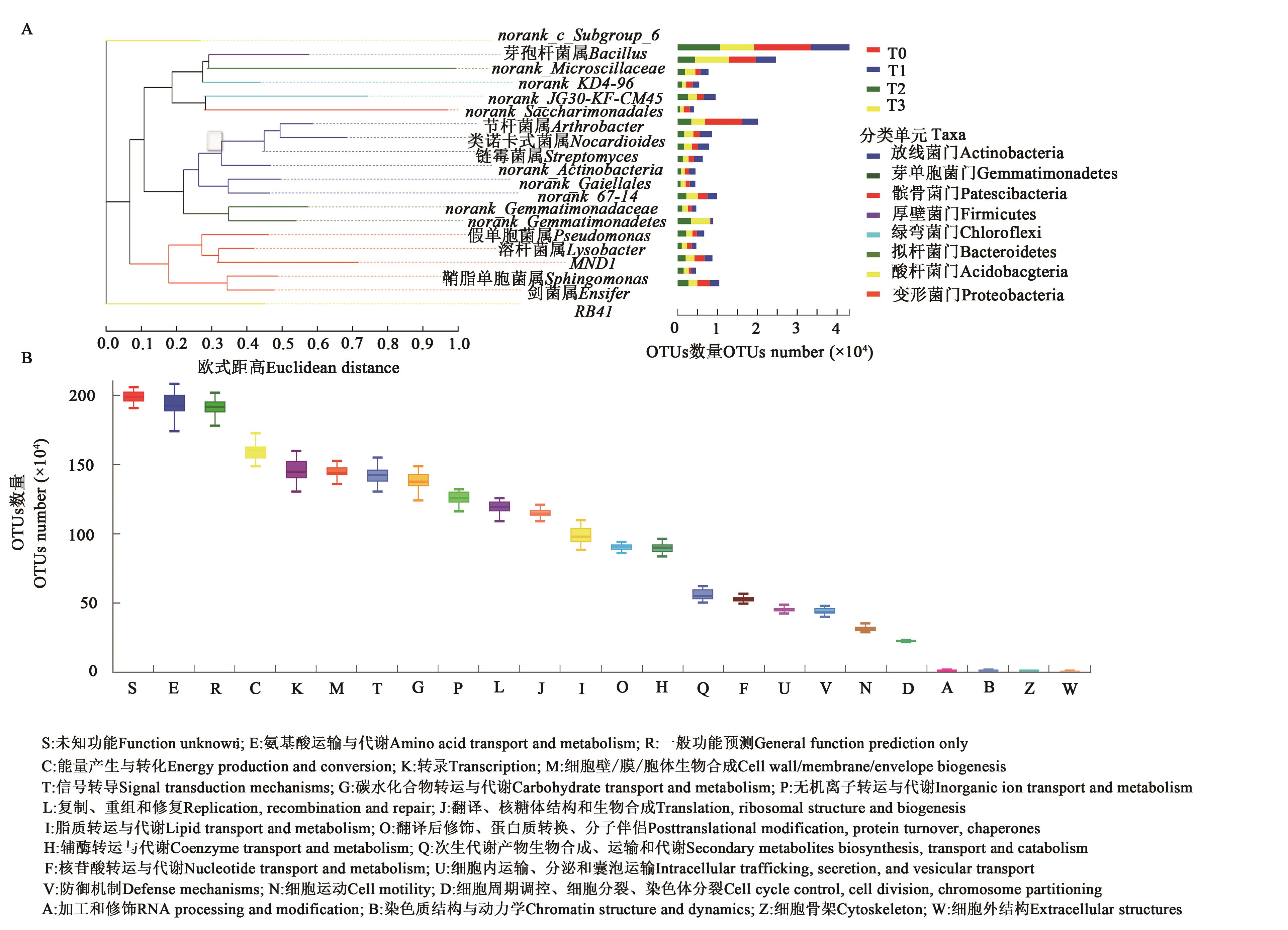 Fig. 5 Taxonomic analysis through phylogenetic tree and microbial functional featuresA: Phylogenetic analysis; B: Functional features of rhizosphere microbe