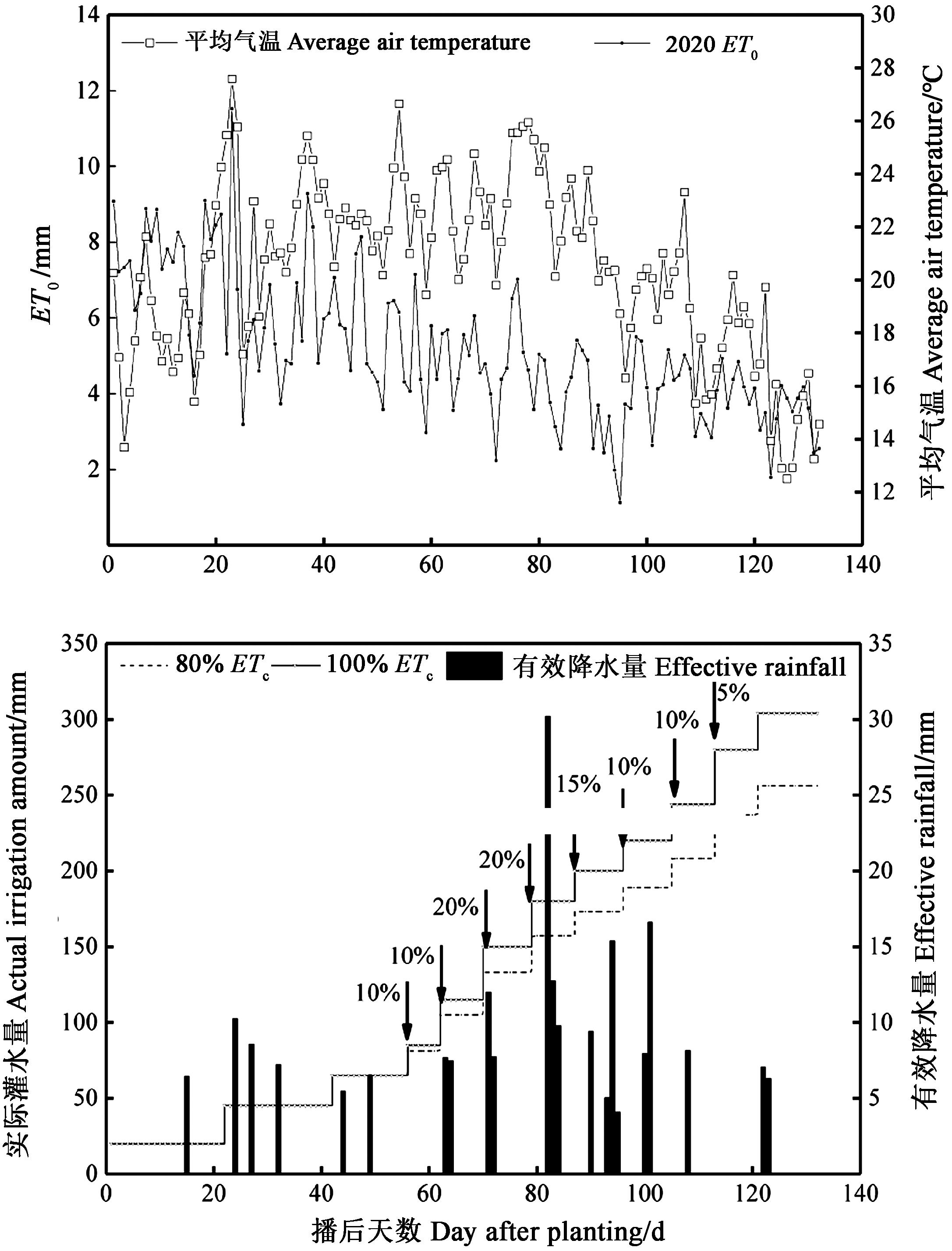 Fig. 1 Reference crop evapotranspiration, air temperature, effective rainfall, actual irrigation amount and fertilizer application rate during tomato growth stage