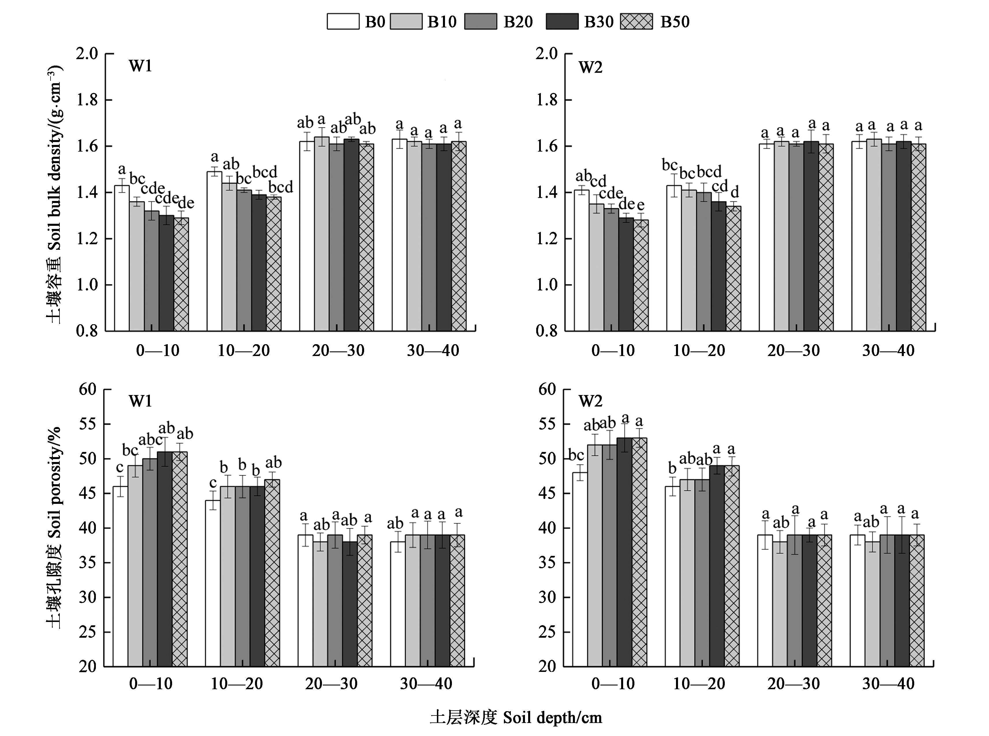 Fig. 2 Soil bulk density and porosity under different treatmentsNote: Different small letters at the same soil layer indicate significant differences at P<0.05 level.