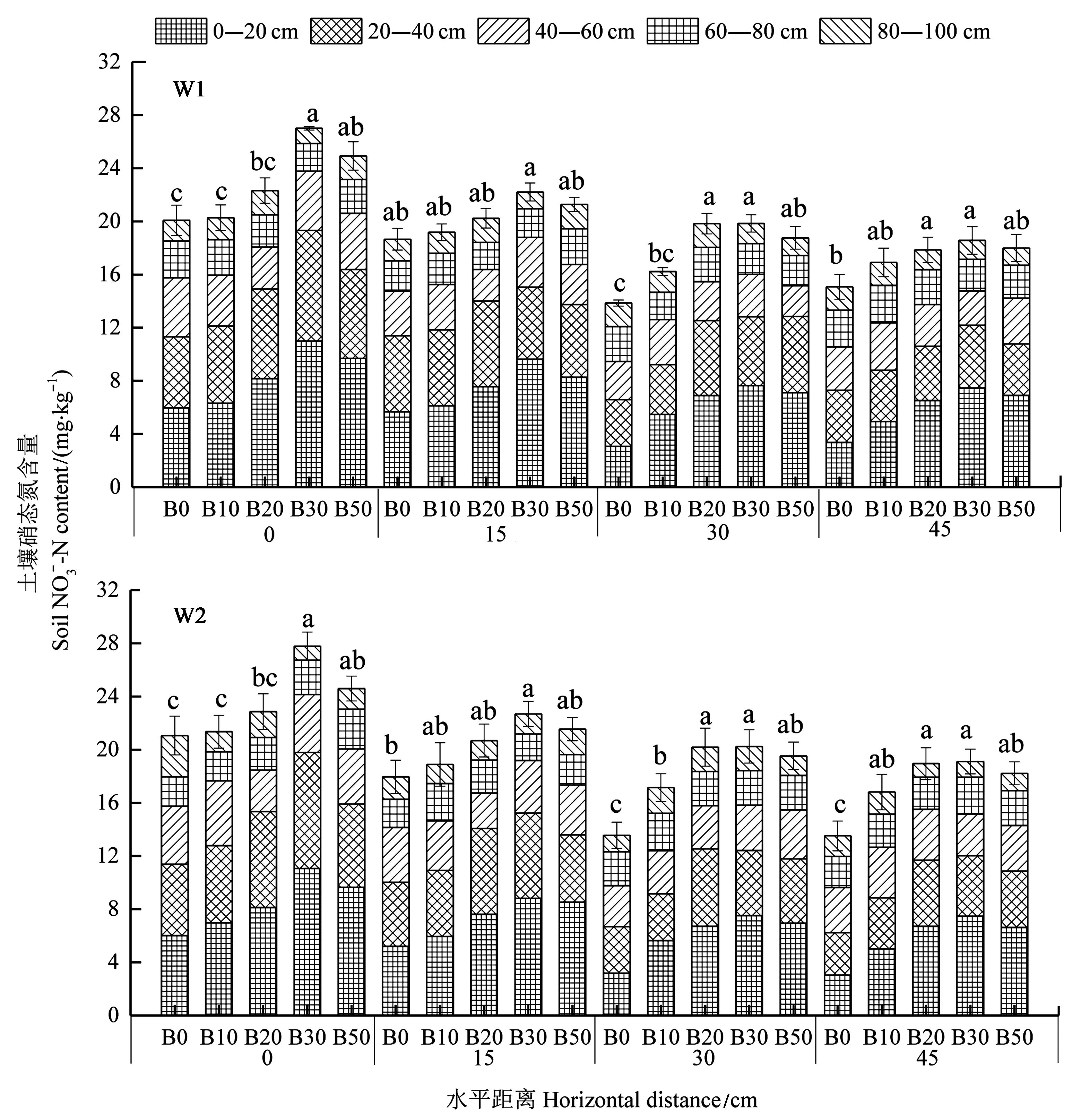 Fig. 5 Soil NO3-?N content under different treatmentsNote:Different small letters at same horizontal distance indicate 0—20 cm soil layers significant differences at P<0.05 level.