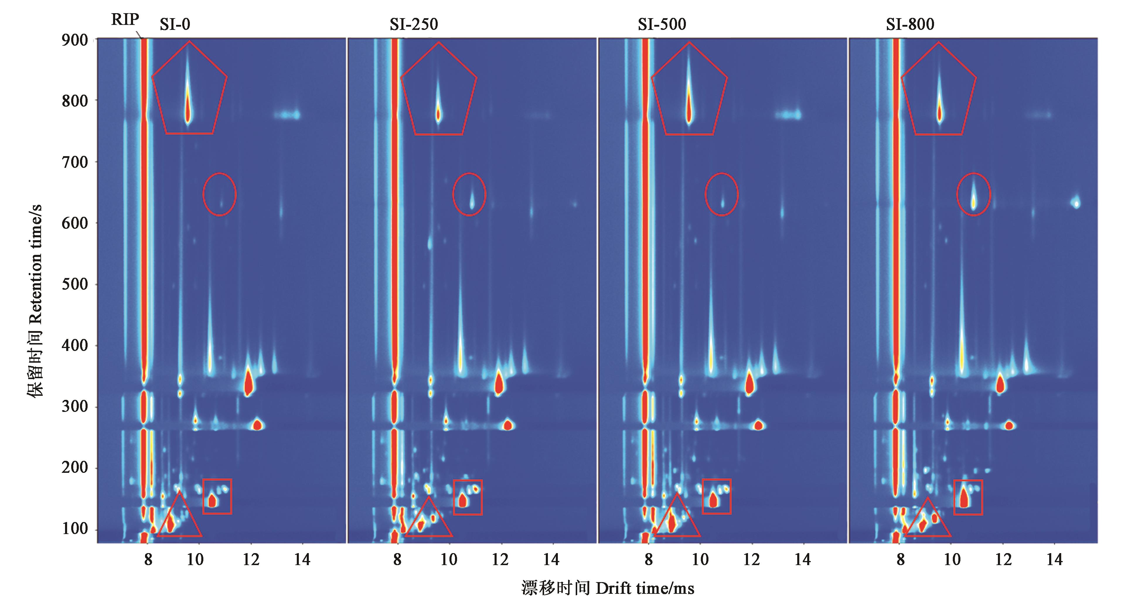 Fig. 2 Gas chromatography?ion mobility spectroscopy of ‘Muscat Hamburg’ grapes with different silicon dosagesNote: Red vertical line represents Reaction ion peak (RIP),each point on both sides of RIP represents a volatile organic compound, and the content of the substance is indicated by color,light blue is low and red is high. A volatile compound may produce one or more bright spots representing monomers or dimers and trimers, depending on the content of the volatile compound.