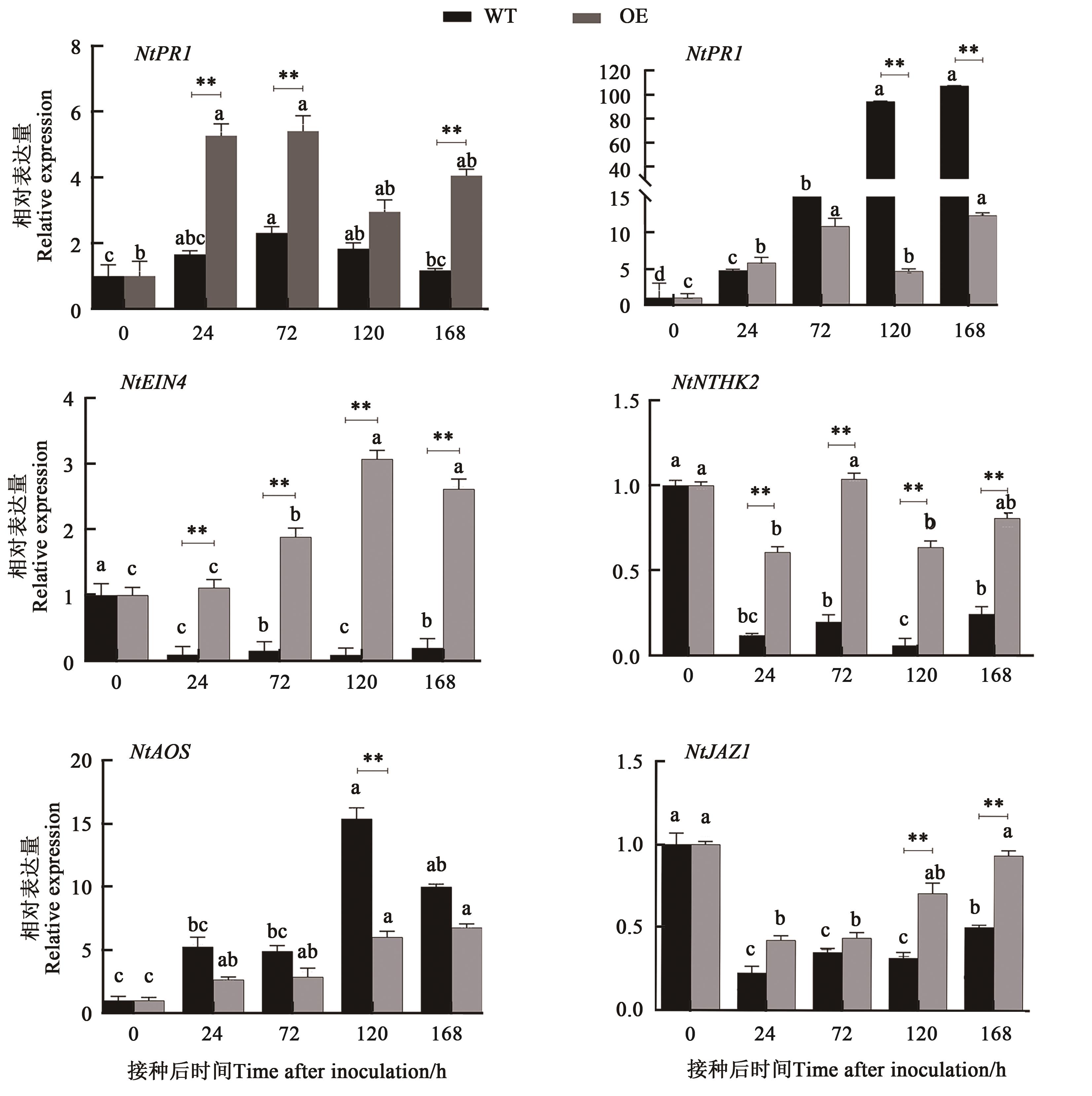 Fig. 5 Expression of disease resistance related genes in wild type and transgenic strains after treatment with Verticillium dahliaeNote: WT—Wild-type plant; OE—Transgenic plant; different lowercase letters indicate significant differences between different types at P<0.05 level; ** indicates significant difference between different quessions in same time at P<0.01 level.