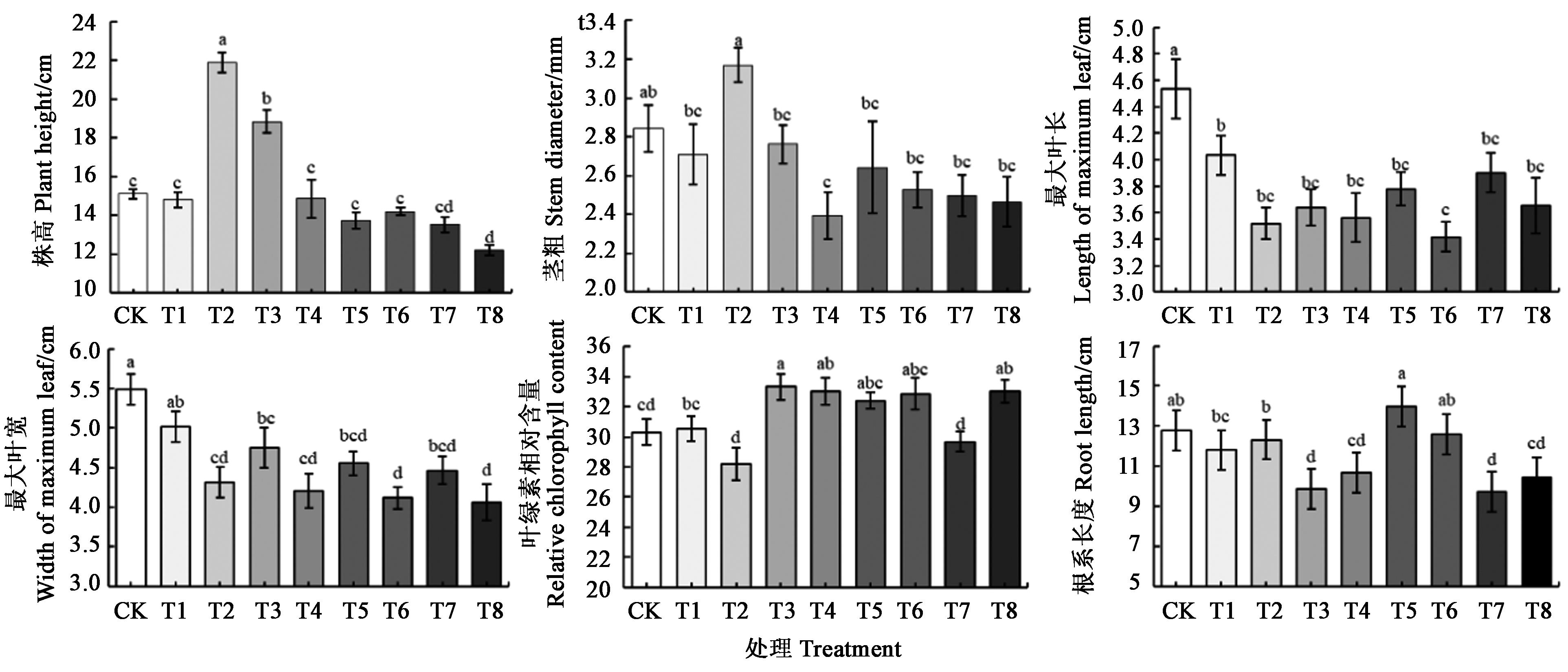 Fig. 1 Coriander growth indexes in different compound substratesNote: Different lowercase letters indicate significant differences between treatments at P<0.05 level.
