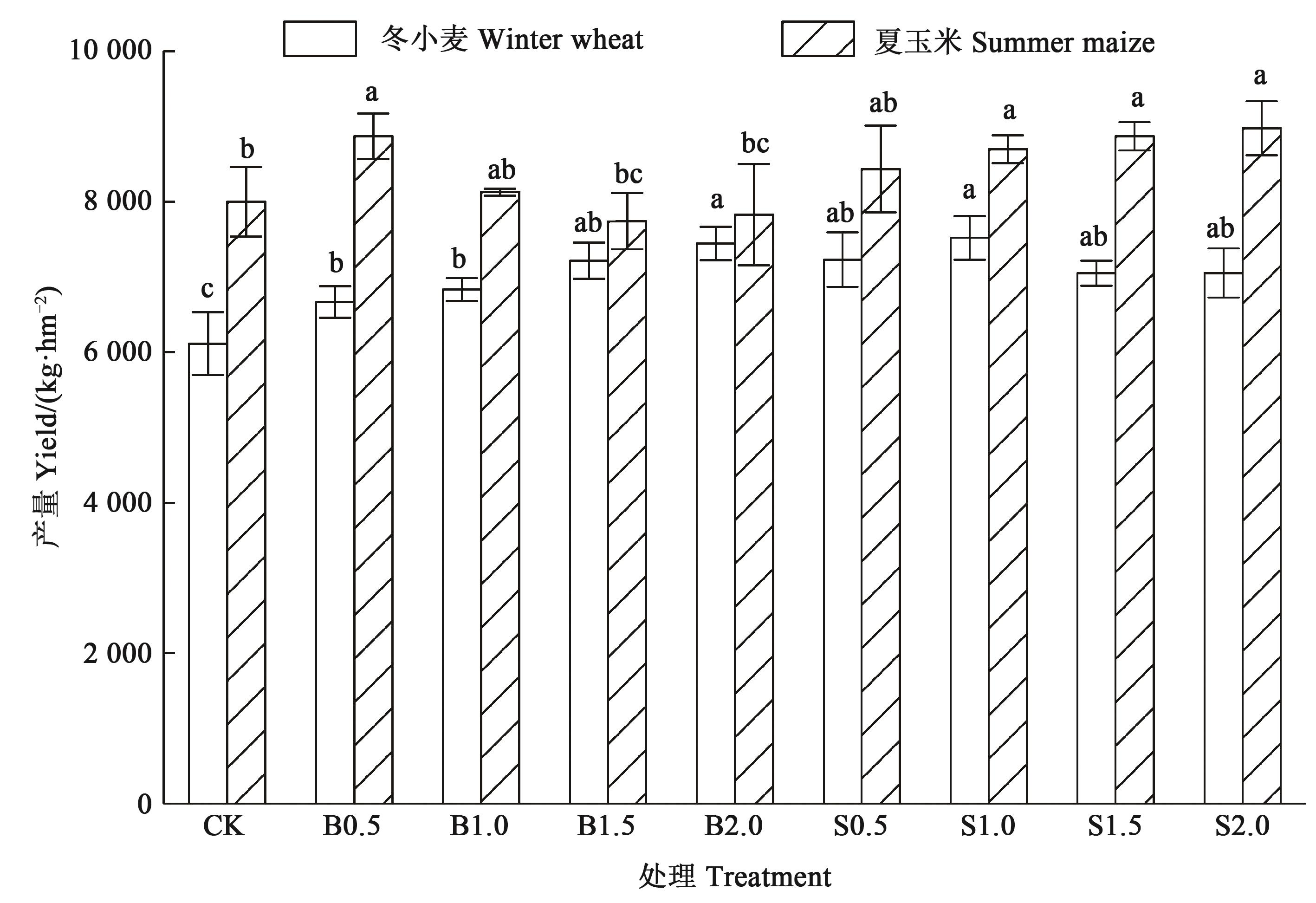 In order to explore the effects of biochar and straw on wheat-maize rotation system in calcareous fluvo-aquic soil area, the single-season returning mode was adopted with maize straw returning in winter wheat season and wheat straw not returning in summer maize season. According to the actual average dry matter mass of corn stalks in the observation plot, the amount of maize straw returned to the field was set to 0.5 (S0.5), 1.0 (S1.0), 1.5 (S1.5) and 2.0 (S2.0) times, the amount of biochar was used to convert the same amount of corn straw into biochar (B0.5, B1.0, B1.5 and B2.0), and no biochar and straw was used as control (CK). The soil nutrition content and crop yield under different treatments were determined. The results showed that biochar and straw treatments could promote the contents of total available nutrients and available nutrients in soil during the growth seasons of winter wheat and summer maize. On the whole, the improvement of soil nutrients in winter wheat and the increase of C/N ratio were higher than those in summer maize. Compared with the control, biochar and straw treatments significantly increased grain yield of winter wheat by 9.04%~21.76% and 15.31%~22.96%, respectively. In summer maize season, B0.5, S1.0, S1.5 and S2.0 treatments significantly increased grain yield by 10.86%, 8.72%, 10.89% and 12.22%, respectively. The effect of biochar and straw on winter wheat yield was higher than that of summer maize, and the effect of straw returning was better. Therefore, on the basis of normal fertilization in the calcareous fluvo-aquic soil area of the Luxi Plain, the applications of 0.5 times of corn straw carbonized biochar and 1.0 times of corn straw in the winter wheat season should not only conducive to improving soil fertility, but also increase the grain yield of winter wheat and summer maize.
