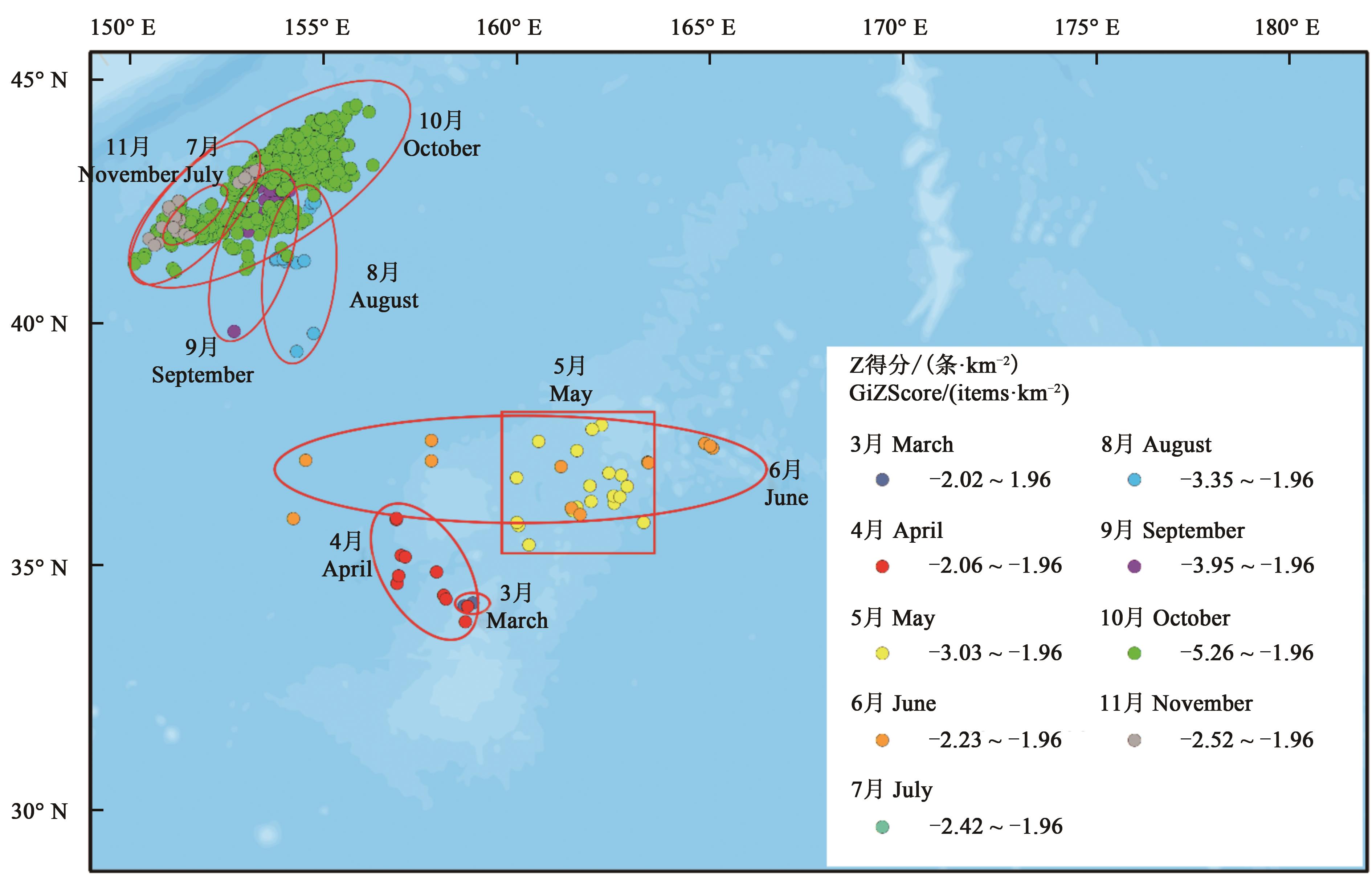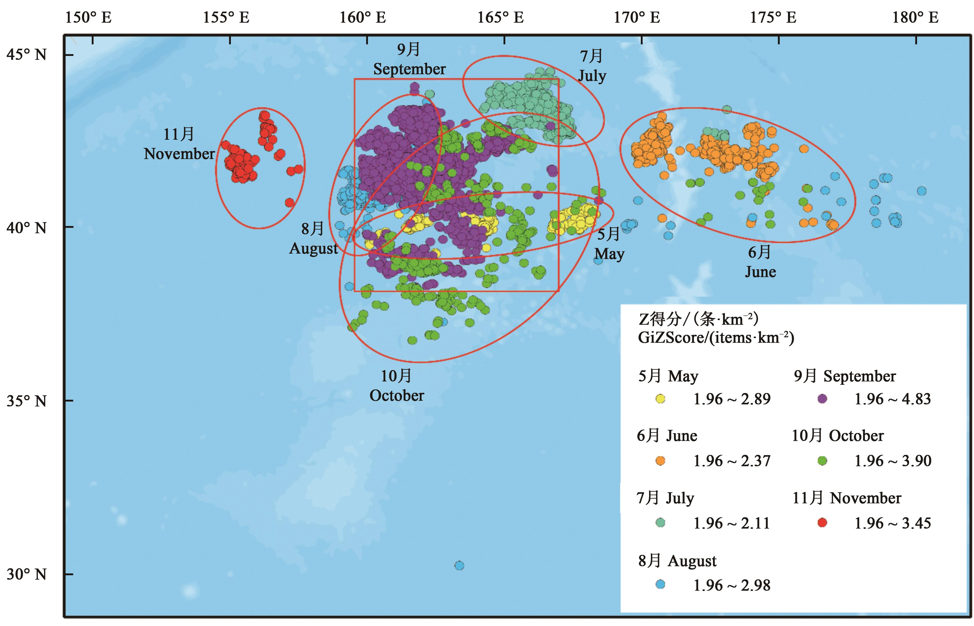 关键词: 卫星数据, 北太平洋, 热点分析, 渔船分布, 作业类型