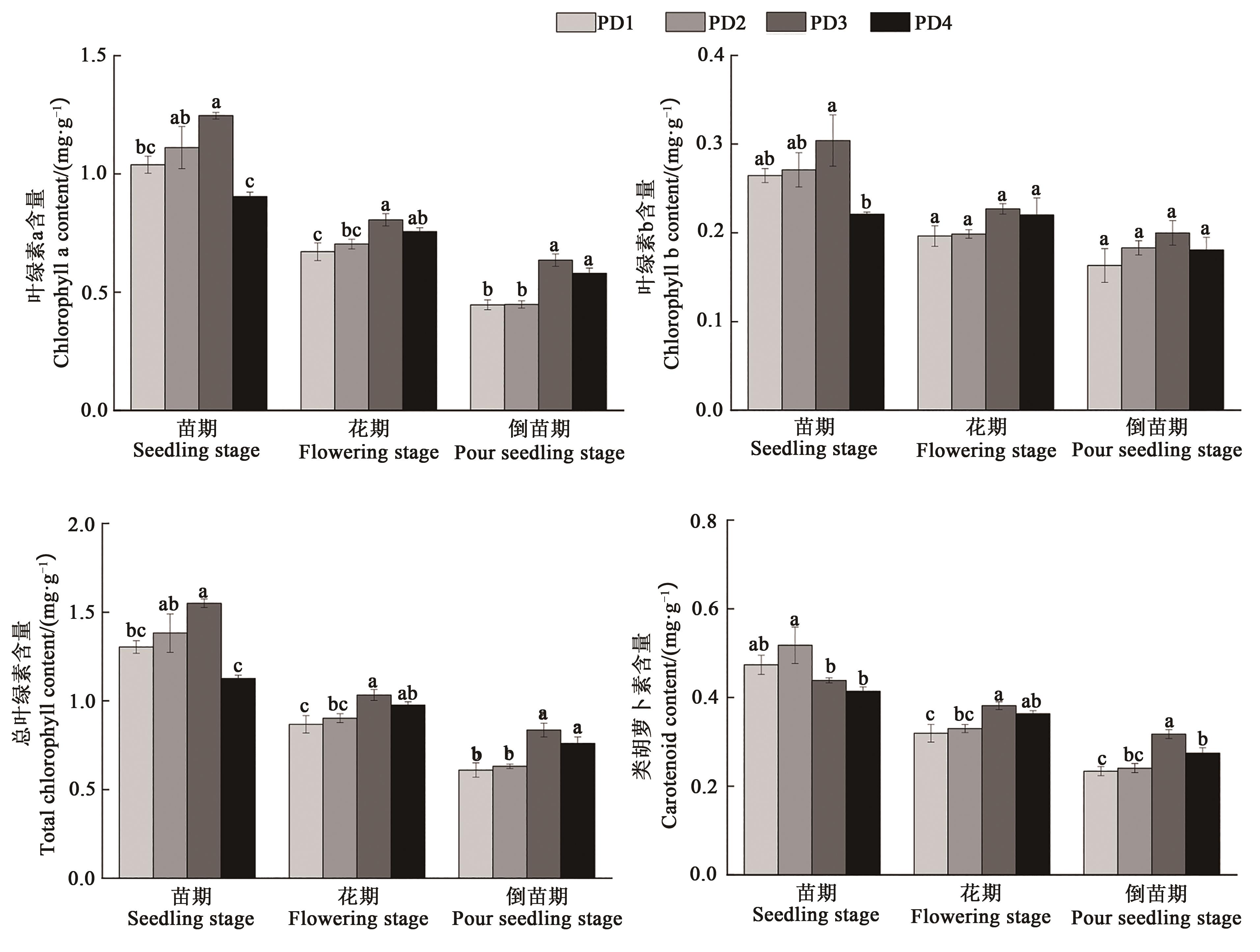 Fig.2 Photosynthetic pigments content of Fritillaria hupehensis with different planting densitiesNote:Different lowercase letters in the same sampling period indicate significant differences between treatments(P<0.05).
