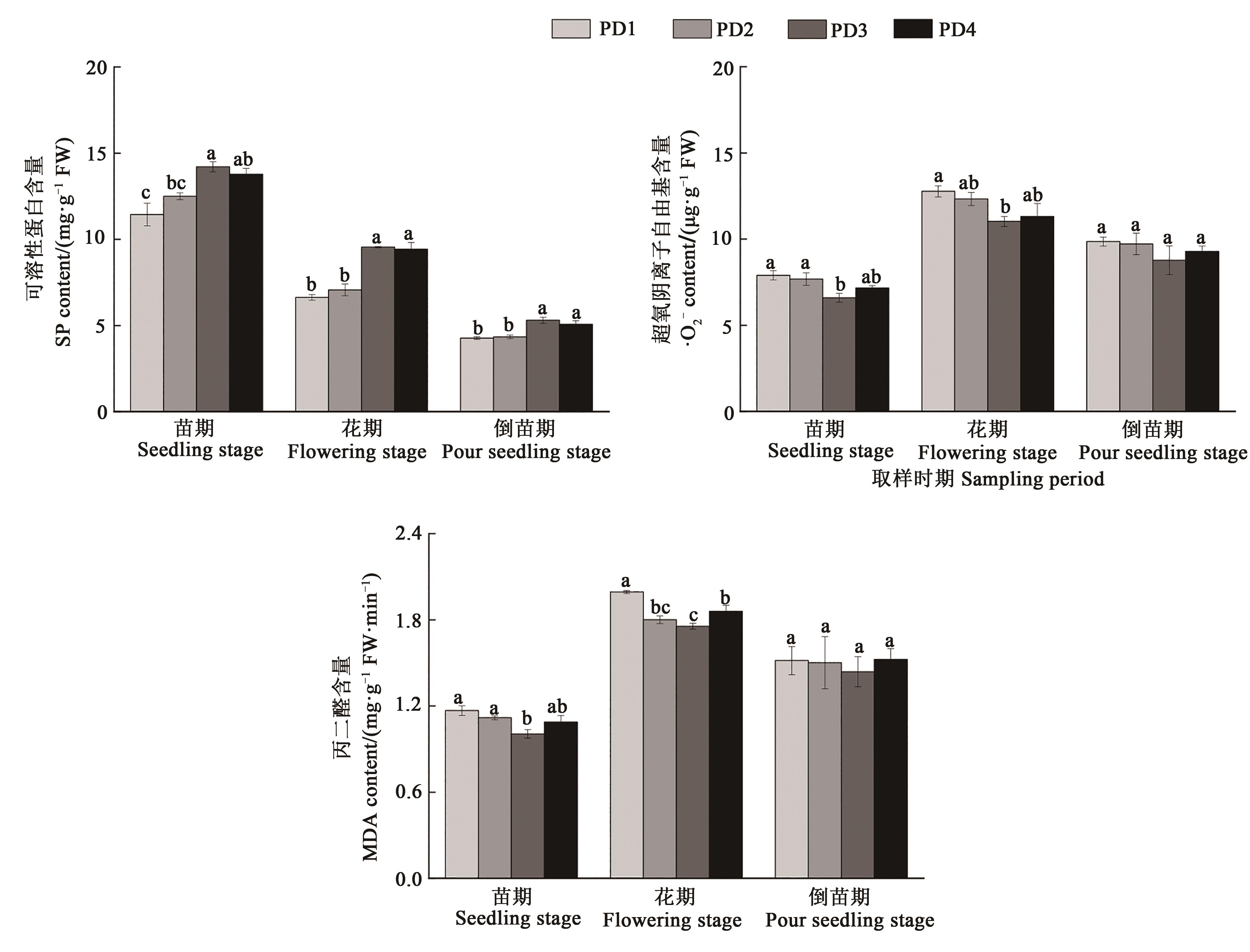 Fig.4 Osmotic regulation of substance content of Fritillaria hupehensis with different planting densitiesNote:Different lowercase letters in the same sampling period indicate significant differences between treatments(P<0.05).