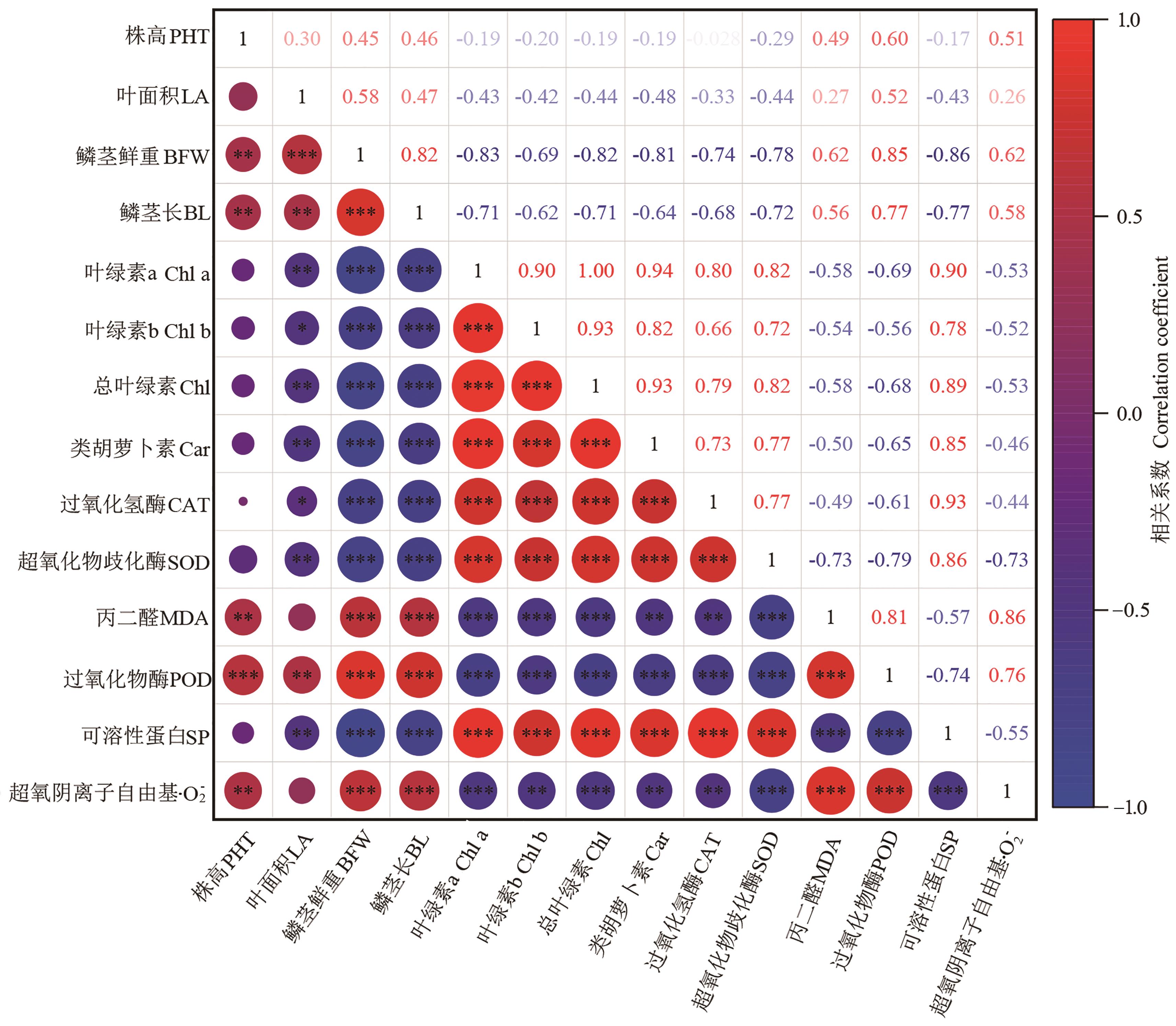 Fig.5 Correlation analysis of physiological growth traits of Fritillaria hupehensisNote:* indicates significant correlation at P<0.05 level, ** indicates significant correlation at P<0.01 level, *** indicates significant correlation at P<0.001 level.