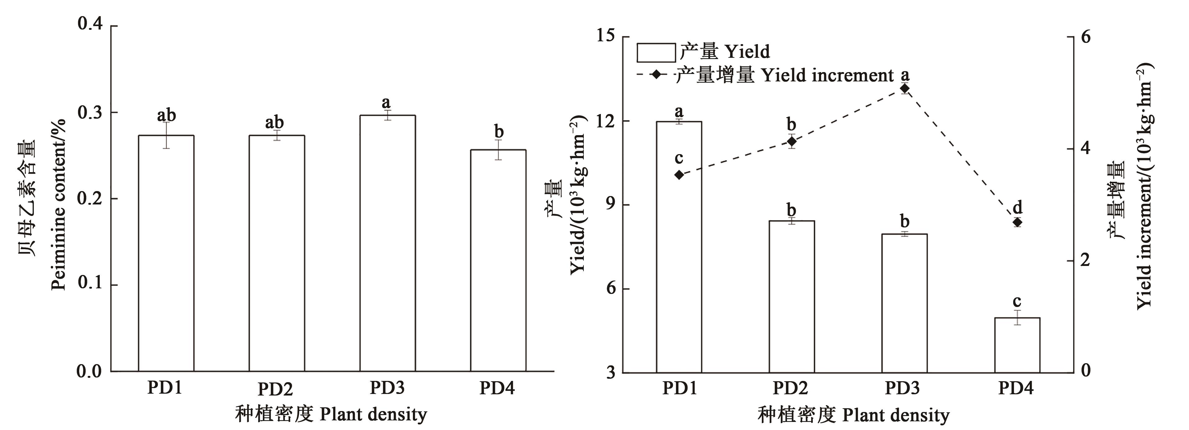 Fig.6 Yield of substance content and peiminine of Fritillaria hupehensis with different planting densitiesNote:Different lowercase letters indicate significant differences between treatments(P<0.05).