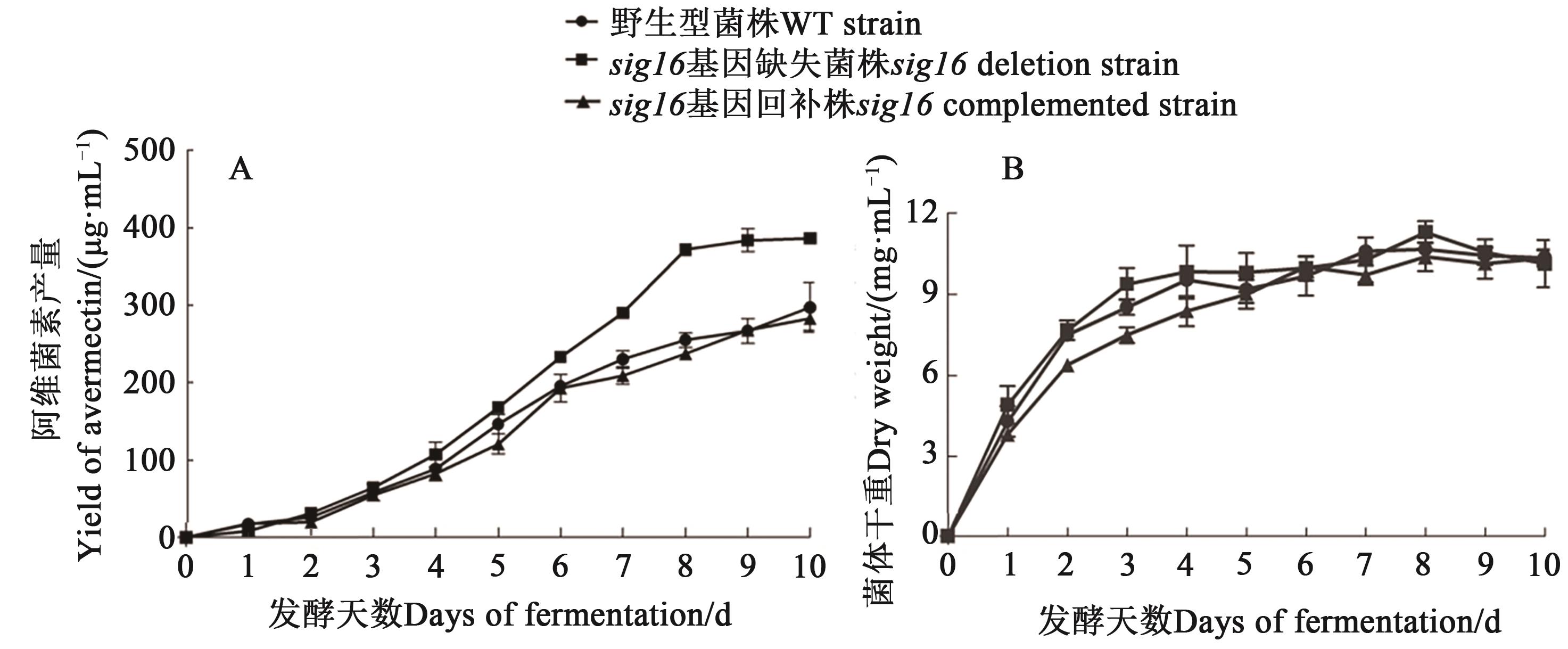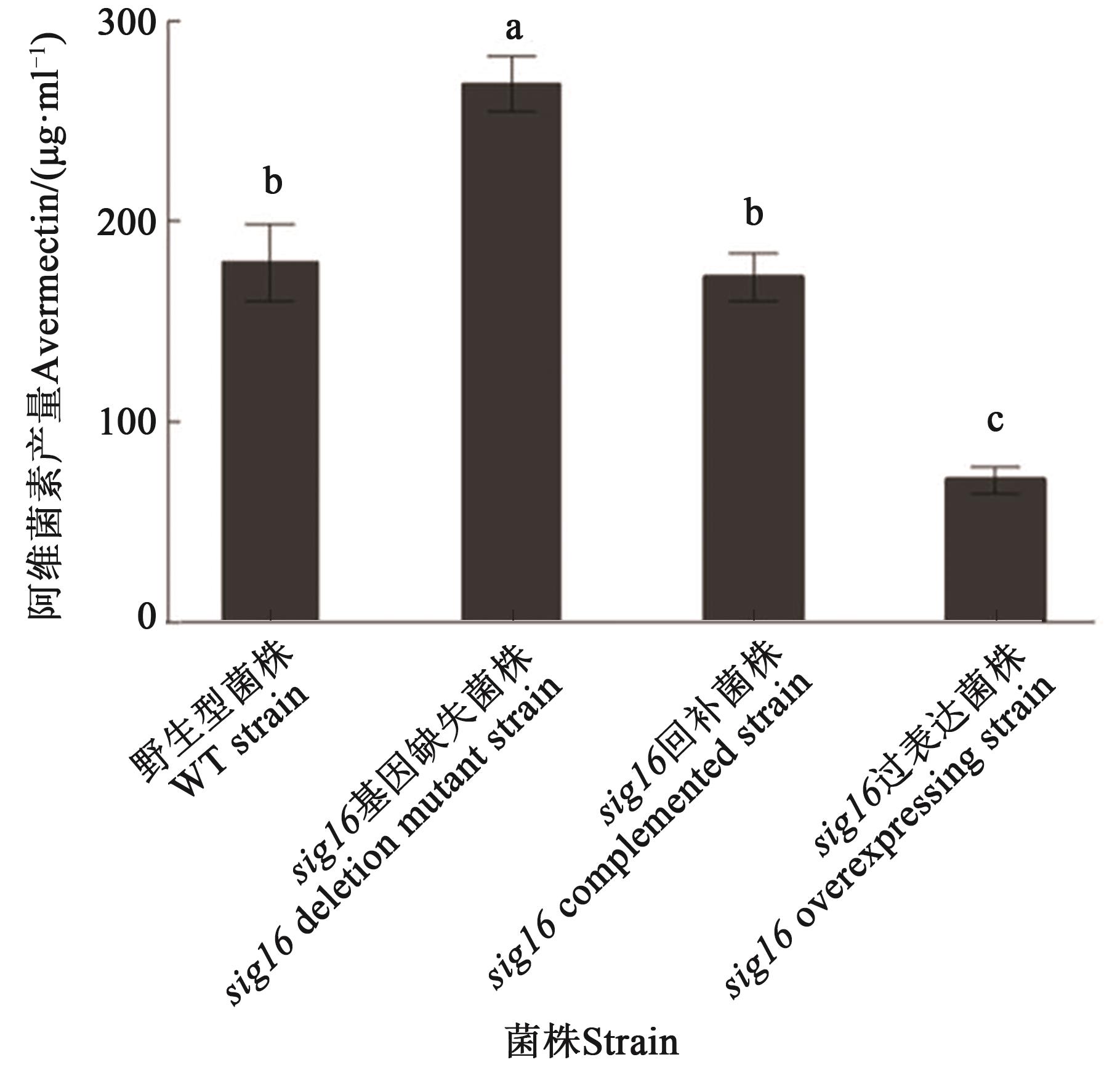 Fig. 2 Avermectin production in WT and sig16 mutant strainsNote: Different lowercase letters indicate significant differences between different strains at P<0.05 level.