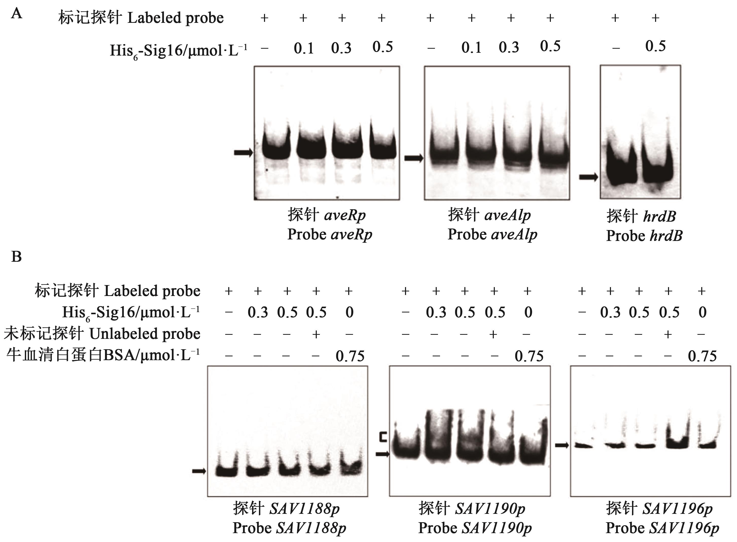 Fig. 4 EMSA assays of His6-Sig16 with probes aveRp, aveA1p, SAV1188p, SAV1190p and SAV1196pA: EMSA assays of the interaction of Probe aveRp, Probe aveA1p with His6-Sig16; B: EMSA assays of the interaction of Probe SAV1188p, Probe SAV1190p and Probe SAV1196p with His6-Sig16; Each reaction contained 0.15 nmol·L-1 DIG-labeled probe, ~100 fold excess of unlabeled specific probe was used for competition assays. Labeled probe hrdB or BSA protein was used as a negative control respectively for probe or His6-Sig16. Concentration of His6-Sig16 for probe hrdB was 0.5 μmol·L-1; arrowhead shows free probes; bracket shows Sig16-DNA complex