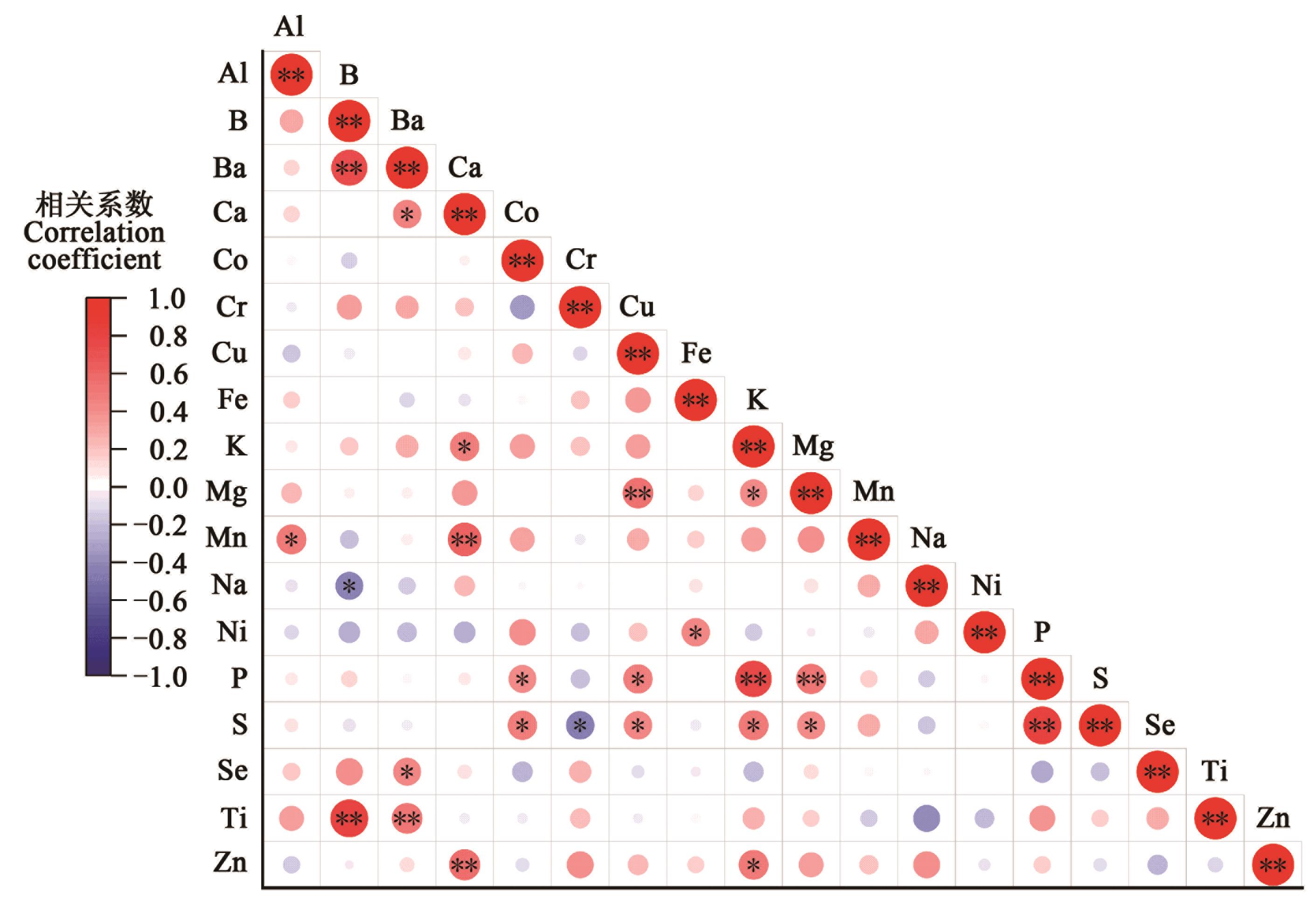 Fig. 1 Correlation among 18 mineral elements in tea flower samplesNote: * and ** indicate significant correlations at P<0.05 and P<0.01 levels, respectively.