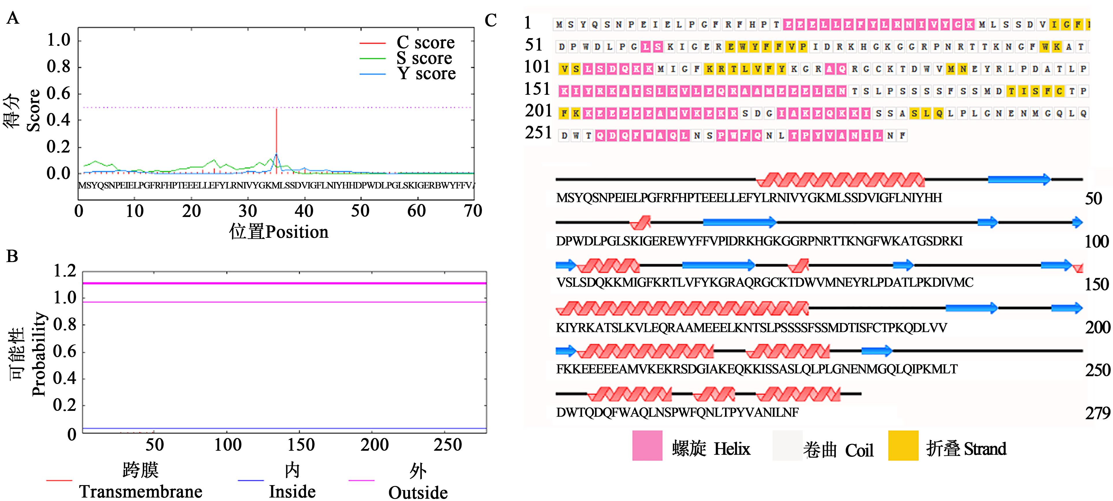 Fig. 2 Structure analysis of GhNAC1 proteinA: Prediction result of GhNAC1 signal peptide; B: Prediction result of GhNAC1 transmembrane domain; C: Prediction of secondary structure of GhNAC1 protein